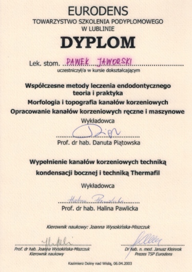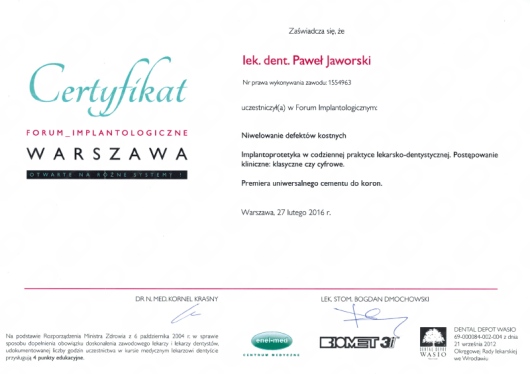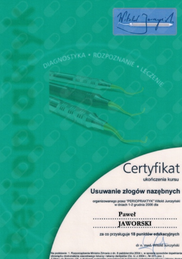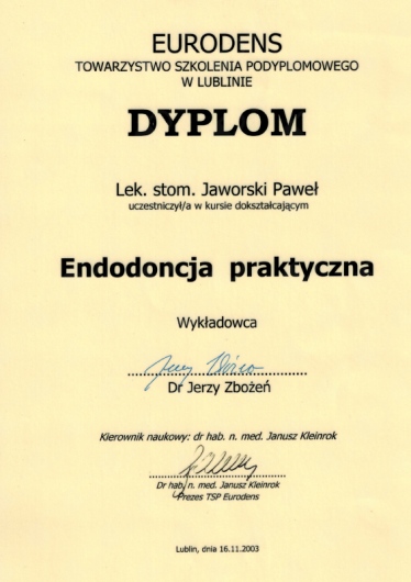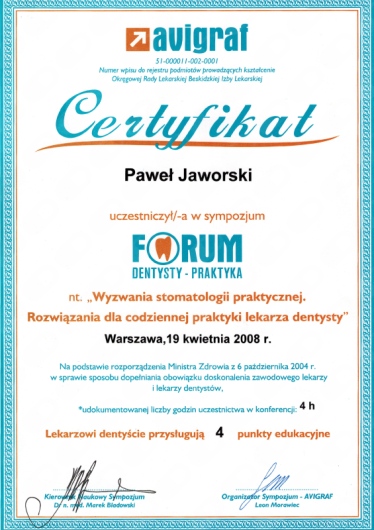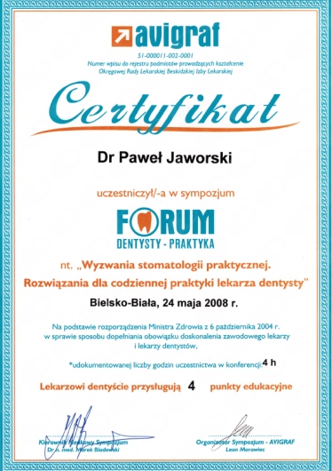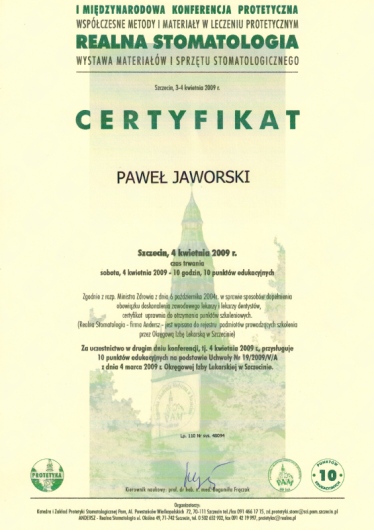 Jaki jest zakres porad oferowanych przez Paweł Jaworski?Paweł Jaworski to stomatolog. Na podstawie swojego doświadczenia i wykształcenia Paweł Jaworski oferuje usługi takie jak: Konsultacja stomatologiczna, Wypełnienie, leczenie kanałowe, leczenie kanałowe pod mikroskopem, Powtórne leczenie kanałowe pod mikroskopem, usunięcie narzędzia z kanału, ekstrakcja zęba, ekstrakcja ósemek, ekstrakcja zatrzymanych ósemek, zastosowanie PRF – osocza bogatopłytkowego z krwi własnej pacjenta w implantologii.