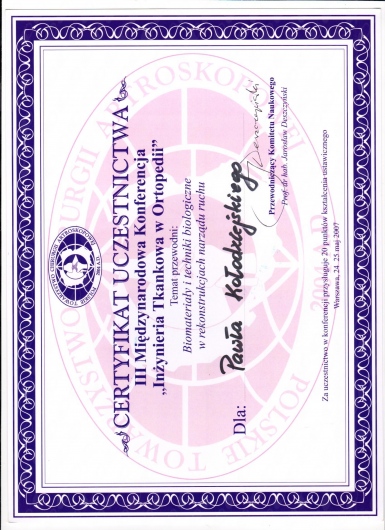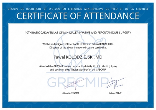 Członek Groupe de Recherche et d'Etude en Chirurgie Mini-Invasive du Pied (GRECMIP) - międzynarodowego towarzystwa propagującego miniinwazyjną chirurgię stopy i stawu skokowego