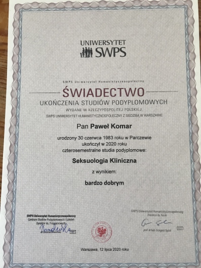 Jaki jest zakres porad oferowanych przez Paweł Komar?Paweł Komar to psychoterapeuta. Na podstawie swojego doświadczenia i wykształcenia Paweł Komar oferuje usługi takie jak: konsultacja online, psychoterapia zaburzeń seksualnych, konsultacja seksuologiczna, psychoterapia uzależnień, konsultacja seksuologiczna dla par (pierwsza wizyta), konsultacja seksuologiczna dla par (kolejna wizyta), Psychoterapia indywidualna video, psychoterapia współuzależnienia, Psychoterapia, konsultacja psychoseksuologa.