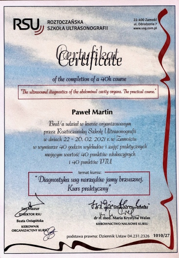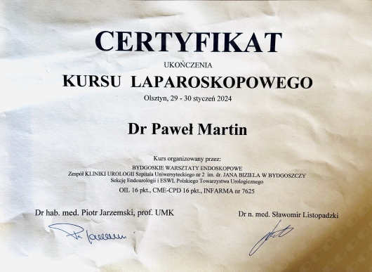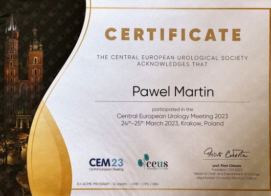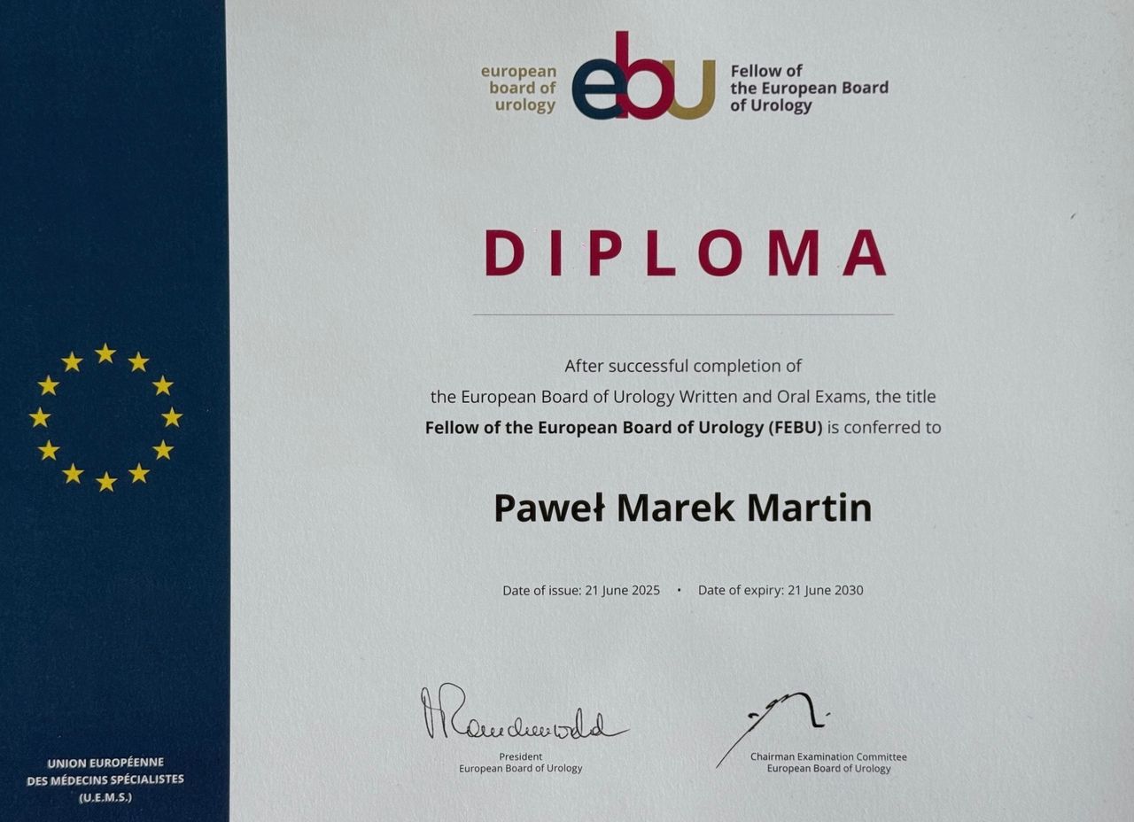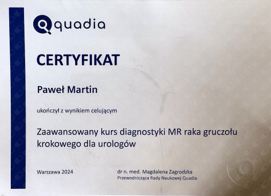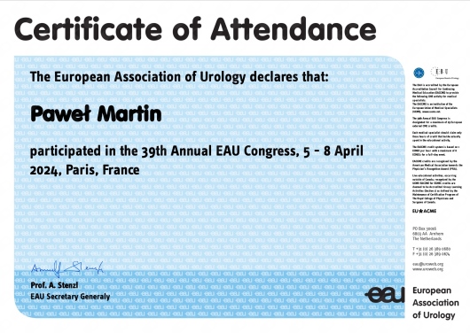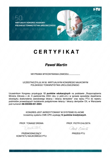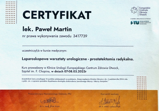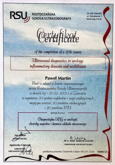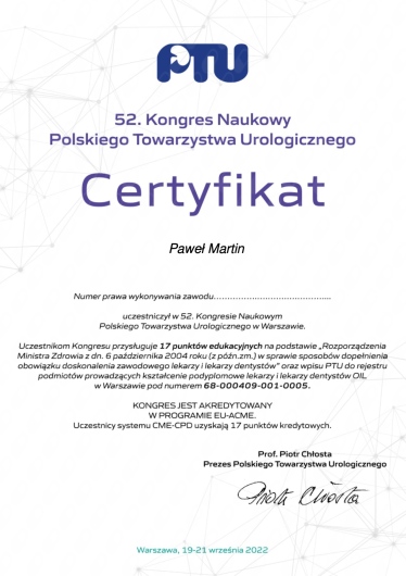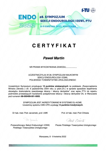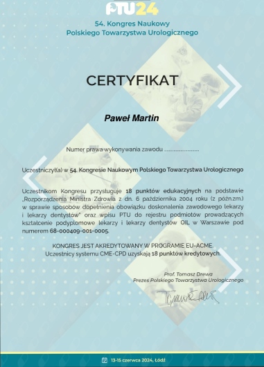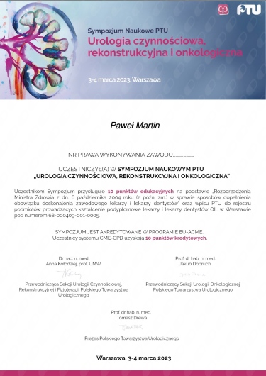 Członek Polskiego Towarzystwa Urologicznego Członek Europejskiego Towarzystwa Urologicznego (EAU) Absolwent Wydziału Lekarskiego Uniwersytetu Medycznego im. Karola Marcinkowskiego w Poznaniu Stale pogłębiam swoją wiedzę biorąc aktywny udział w konferencjach naukowych o zasięgu krajowym i międzynarodowym oraz licznych stażach/kursach praktycznych w Polsce i za granicą (patrz - certyfikaty). W swojej praktyce zajmuje się głównie diagnostyką i leczeniem małoinwazyjnym nowotworów urologicznych oraz kamicy układu moczowego.