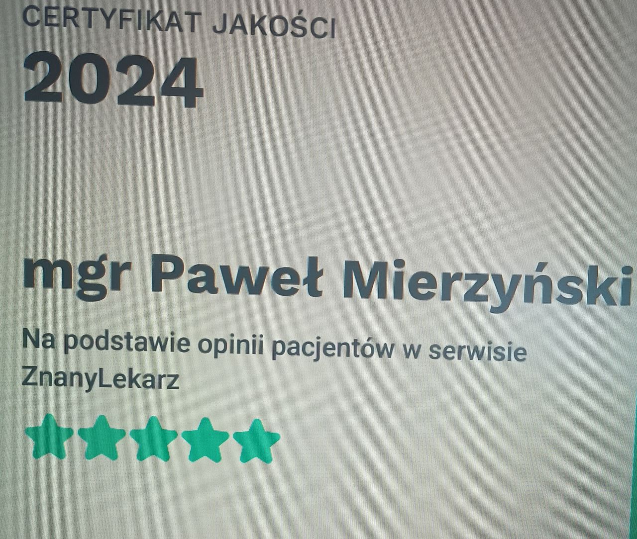 Czy Paweł Mierzyński przyjmuje online, bez konieczności pojawiania się w placówce?Tak, Paweł Mierzyński oferuje konsultacje online. Wybierz opcję „konsultacja online” przy umawianiu wizyty, a zobaczysz dostępne terminy.