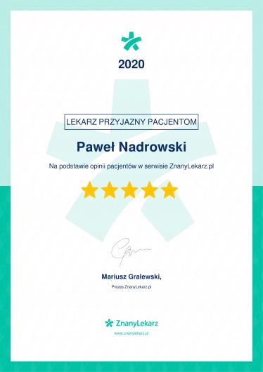 Jak Paweł Nadrowski umawia wizyty?Paweł Nadrowski używa kalendarza ZnanyLekarz, dlatego na stronie widzisz aktualne terminy. Wystarczy, że wybierzesz datę i godzinę, które odpowiadają Ci najbardziej. Umawianie wizyty jest darmowe, a tuż przed terminem wyślemy Ci przypomnienie.
