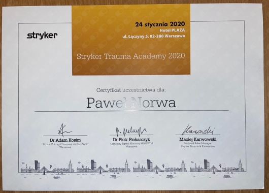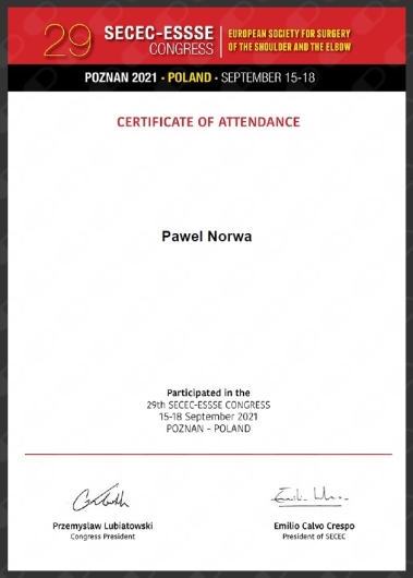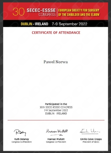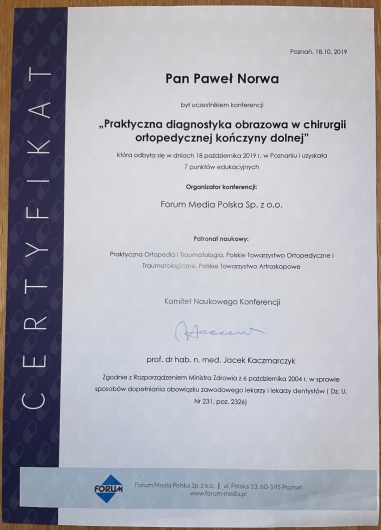 Jestem aktywnym uczestnikiem wielu konferencji i kursów zagranicznych oraz stypendystą szkoły artroskopii PTArto.