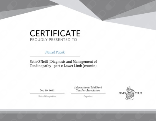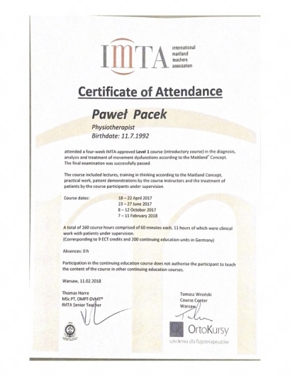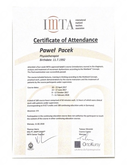 - Terapia manualna wg koncepcji Maitland (poziom 1, 2a, 2b, 3 – 440 godzin nauki)