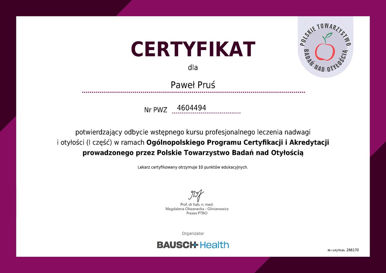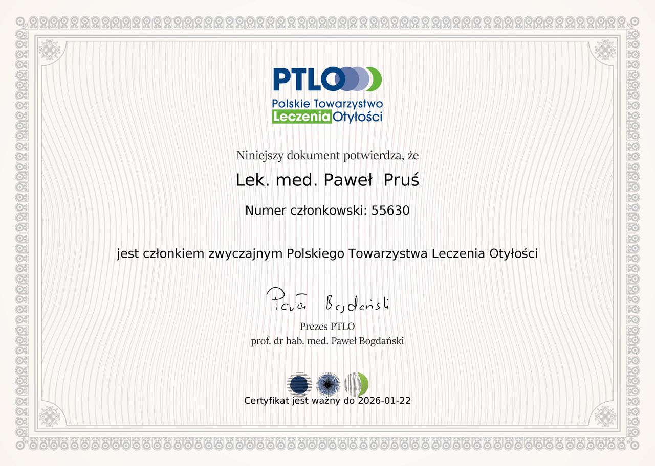 Jestem lekarzem zajmującym się leczeniem otyłości. Pomagam pacjentom trwale pokonać chorobę otyłościową, oferując całościową opiekę i indywidualne podejście do terapii. Posiadam certyfikat I stopnia PTBO. Jestem członkiem Polskiego Towarzystwa Leczenia Otyłości, w trakcie certyfikacji PTLO.
