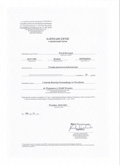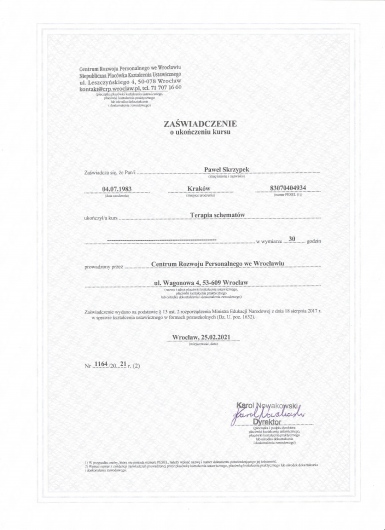 Pan Paweł prowadził mnie przez około 1,5 roku w terapii (psychodynamicznej) w gabinecie w Centrum Dobrej Terapii Nowa Huta, w trakcie której mierzyłam się z problemami rodzinnymi, trudną historią i relacjami z rodzicami. Bardzo ceniłam jego zaangażowanie, spokój i przyjazne nastawienie, które wspierały cały proces, a ja czułam się bezpiecznie rozmawiając o moich problemach i przeżyciach. Polecam z pełnym przekonaniem.