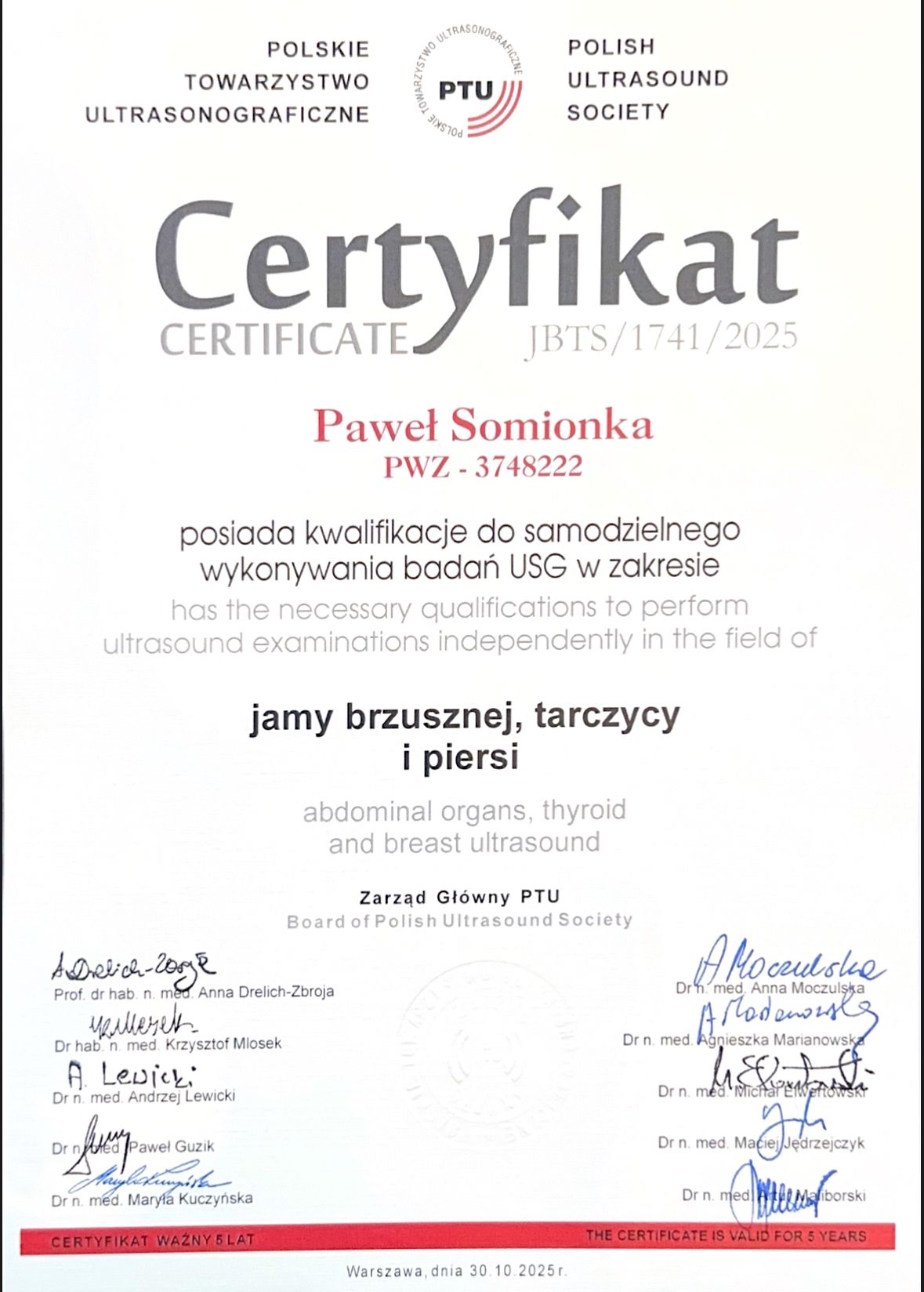 Jaki jest zakres porad oferowanych przez Paweł Somionka?Paweł Somionka to w trakcie specjalizacji (chirurg). Na podstawie swojego doświadczenia i wykształcenia Paweł Somionka oferuje usługi takie jak: USG jamy brzusznej, USG tarczycy, Nacięcie ropnia, usuwanie znamion, tłuszczaków, kaszaków, włókniaków, Konsultacja chirurgiczna, USG piersi.
