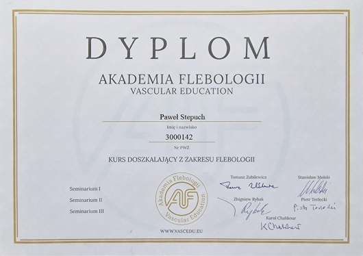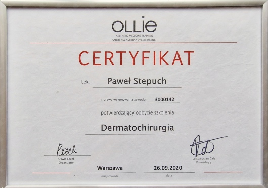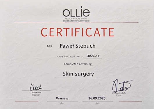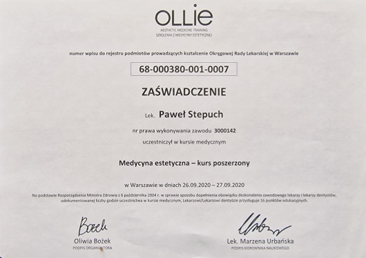W zakresie tym wykorzystuję wiedzę i doświadczenie zdobyte podczas kursów z dermatochirurgii, 2-letnich studiów medycyny estetycznej SLDE Warszawa (2019-2020) oraz ukończonej w 2019 r. pierwszej edycji szkolenia Akademia Flebologii.