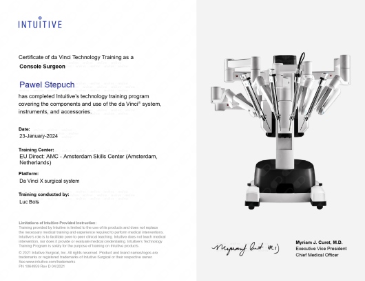 W styczniu b.r. ukończyłem szkolenie zakończone egzaminem operatora systemu robotycznego daVinci w Amsterdam Skills Center