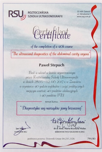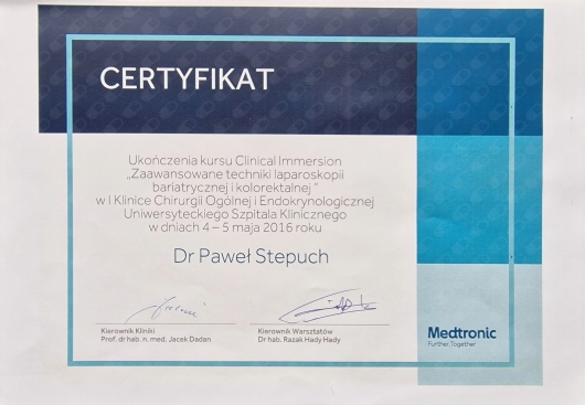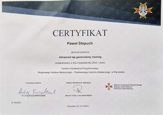 Specjalizację rozpocząłem w Oddziale Chirurgii Ogólnej i Małoinwazyjnej SPZOZ Łęczna, następnie kontynuowałem szkolenie w Klinice Chirurgii Ogólnej Transplantacyjnej i Leczenia Żywieniowego SPSK4 Lublin gdzie zakończyłem szkolenie specjalizacyjne w 2021r.
