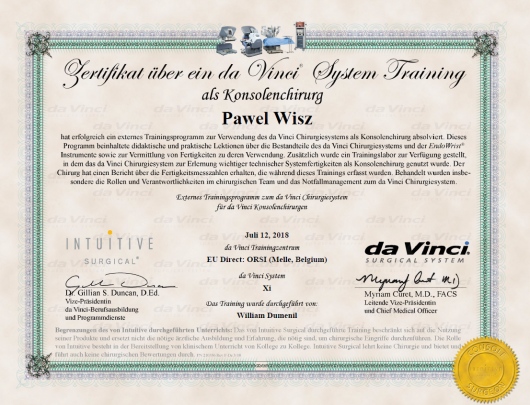 Jako jeden z 12 urologów w Europie, odbyłem kurs Masterclass dla zaawansowanych operatorów da Vinci, pod kierownictwem prof. Patela z USA.