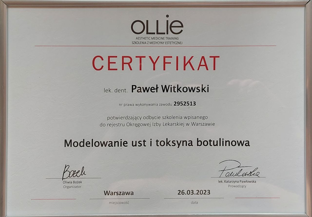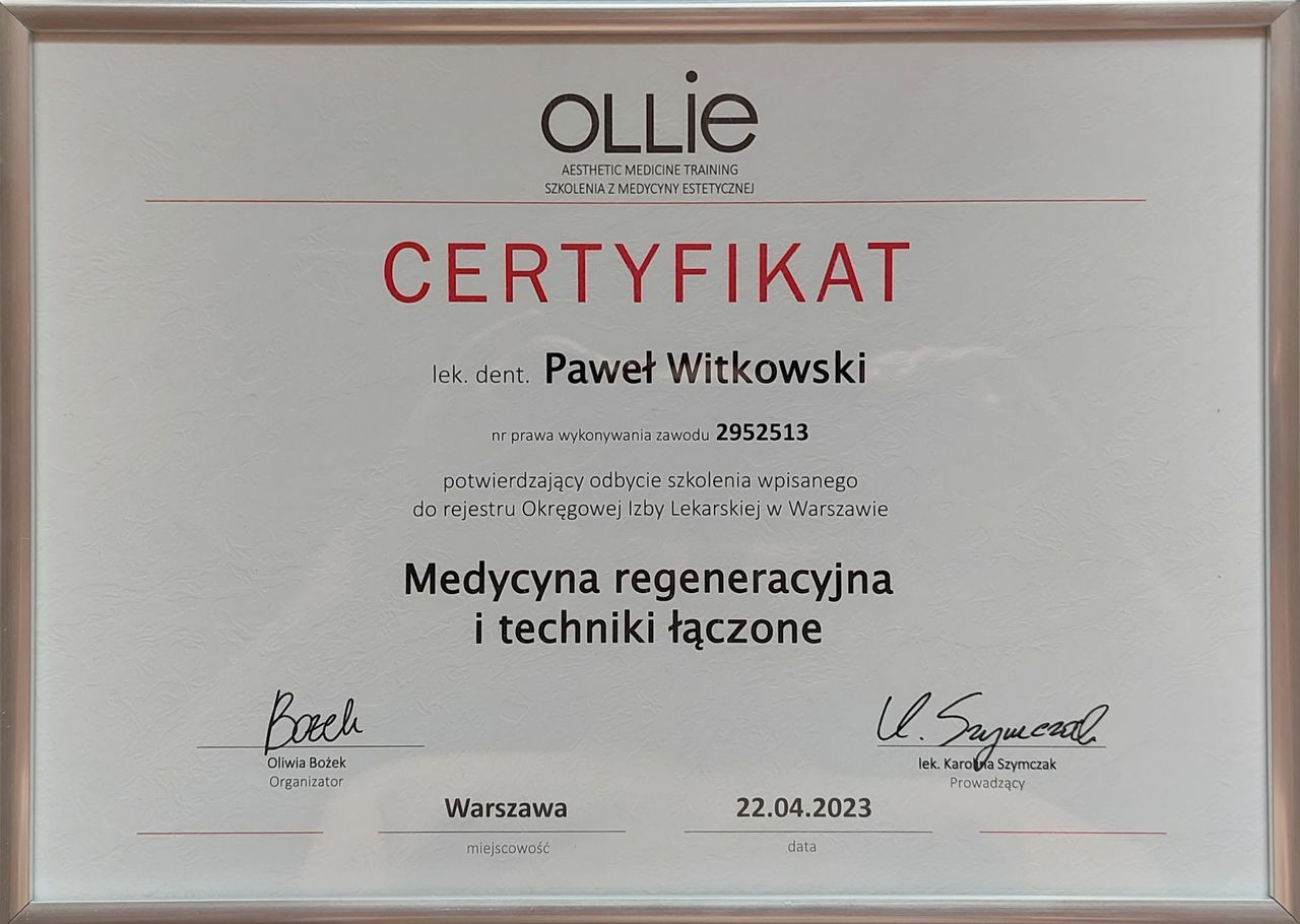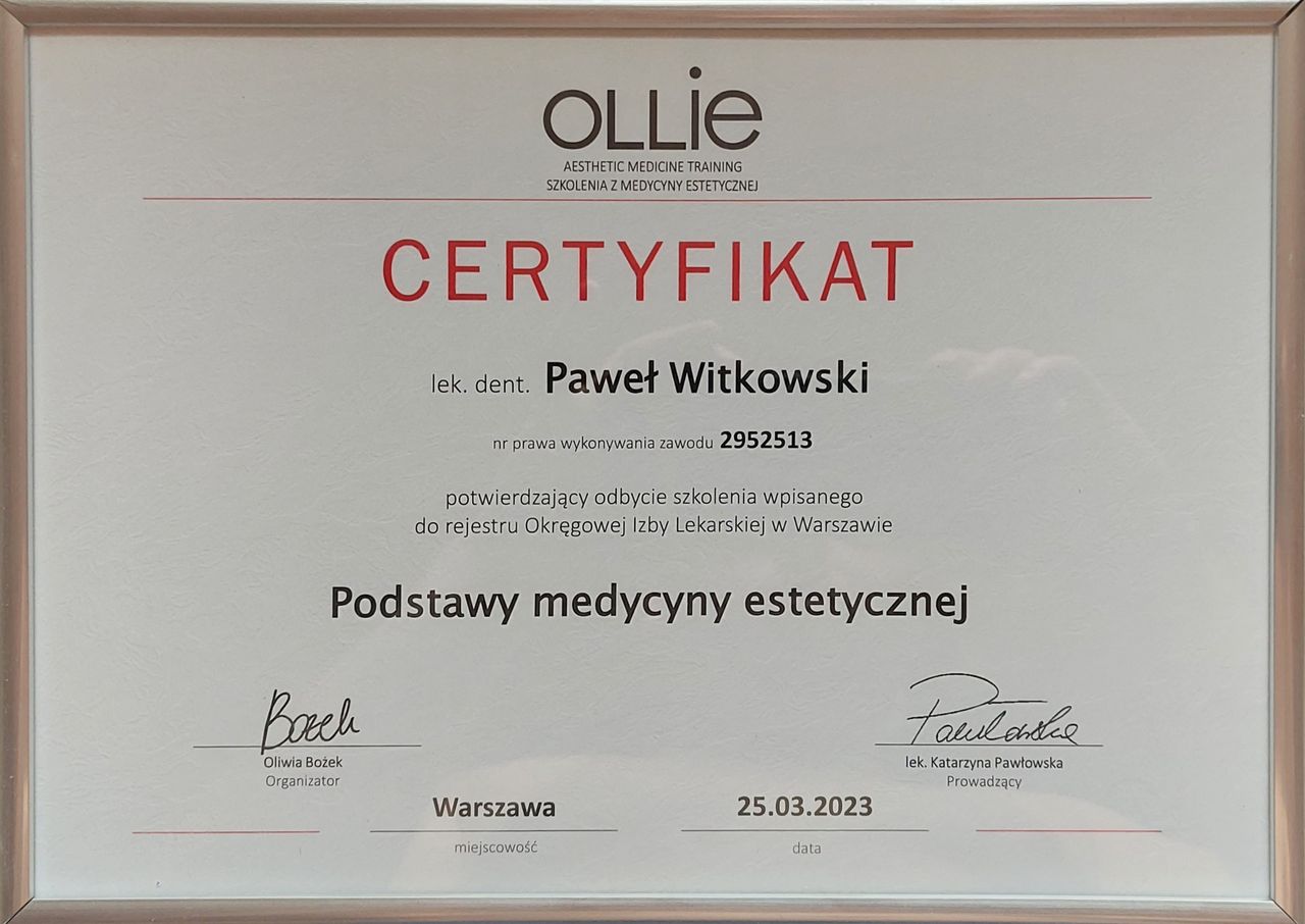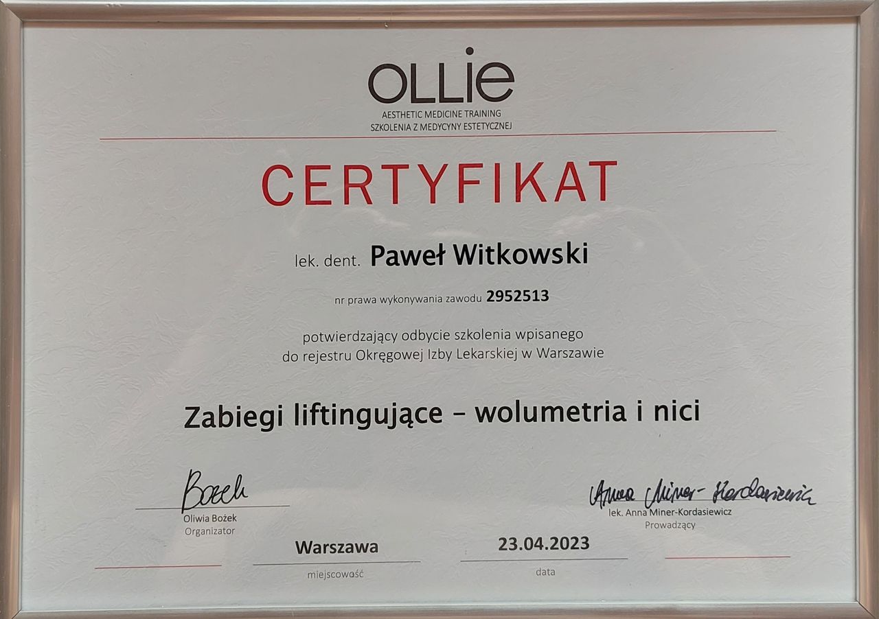 Moje zainteresowanie medycyną estetyczną zaowocowało ukończeniem szeregu certyfikowanych szkoleń organizowanych przez OLLIE Aesthetic Medicine Training. Posiadam umiejętności w zakresie: