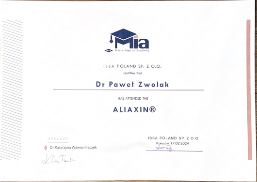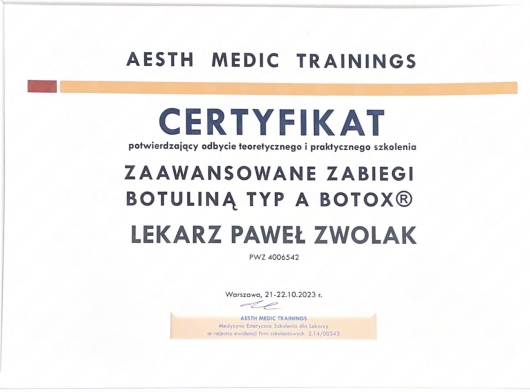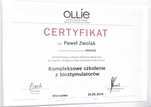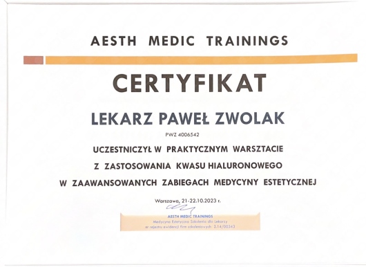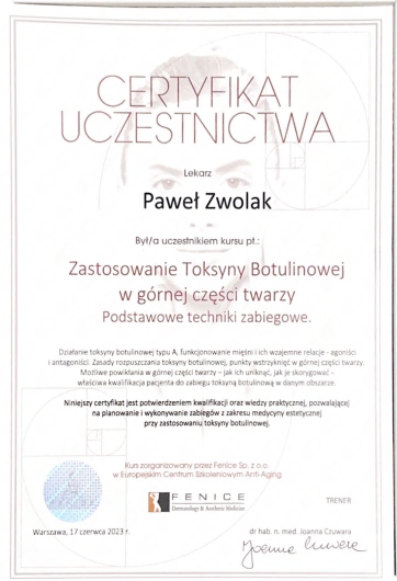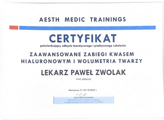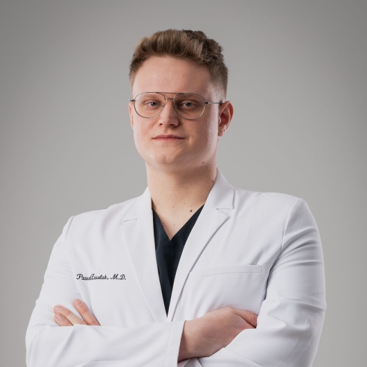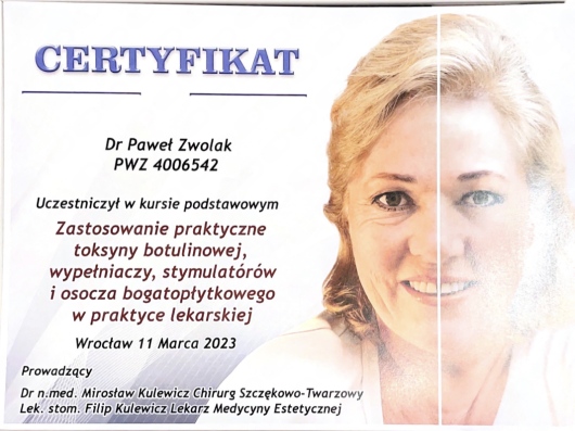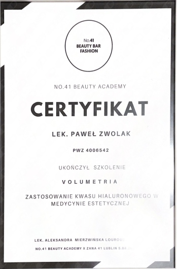 Dr Paweł Zwolak to lekarz specjalizujący się w medycynie estetycznej oraz okulistyce. Jest absolwentem renomowanego Gdańskiego Uniwersytetu Medycznego oraz Uniwersytetu Grenoble Alpes we Francji. Swoje doświadczenie zawodowe poszerzał podczas praktyk w Szpitalu Uniwersyteckim w Genewie, zdobywając solidne fundamenty w zakresie nowoczesnych technik medycznych. Posiada tytuł Master of Aesthetic Medicine, Nutrition and Anti-Ageing, który uzyskał w ramach wspólnego programu Uniwersytetu Medycznego w Łodzi i Uniwersytetu w Madrycie. Jego kompetencje potwierdzają liczne certyfikaty z zakresu stosowania toksyny botulinowej, iniekcji kwasu hialuronowego oraz stymulatorów tkankowych. Z pasją i zaangażowaniem wykonuje zabiegi medycyny estetycznej, dbając o zdrowie, naturalne piękno i komfort swoich pacjentów. W ramach specjalizacji okulistycznej zajmuje się również chirurgią powiek, w tym blefaroplastyką powiek górnych. Dzięki połączeniu precyzji, doświadczenia i najnowszych metod leczenia, oferuje usługi na najwyższym poziomie.
