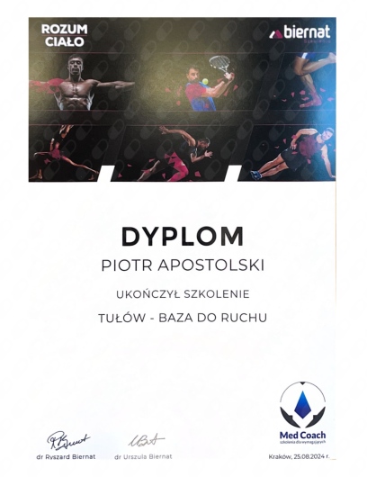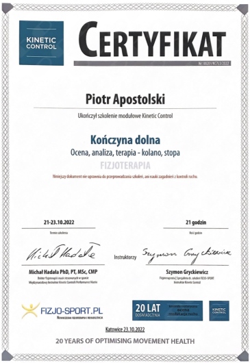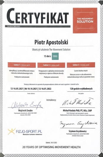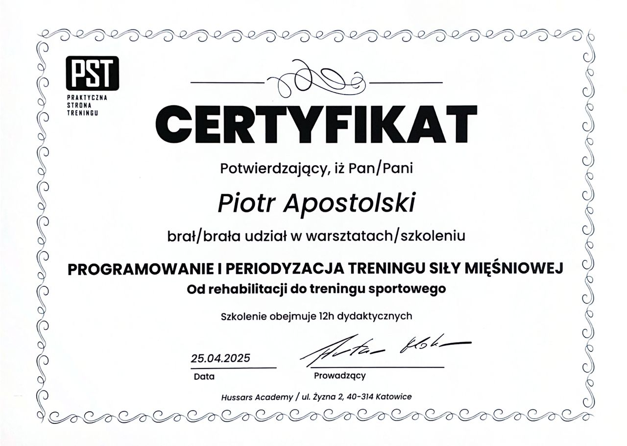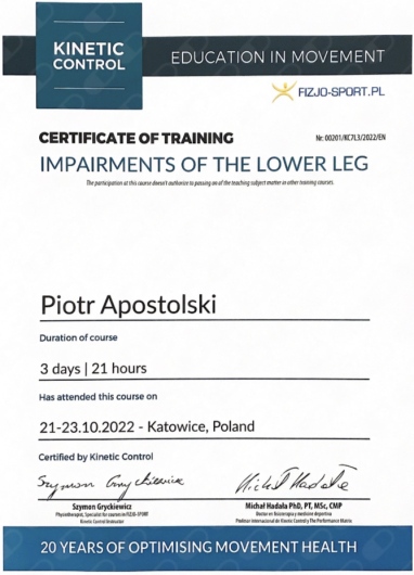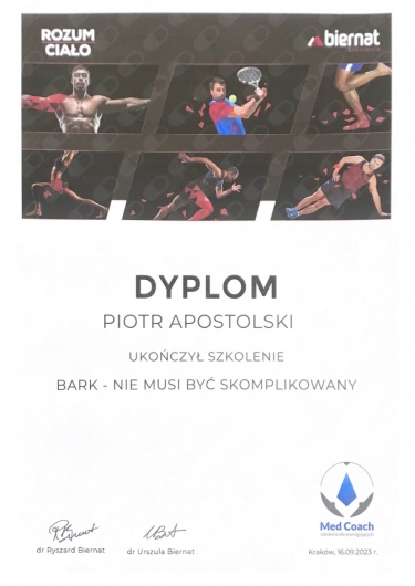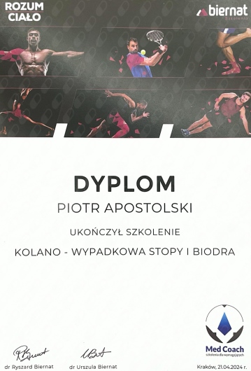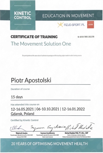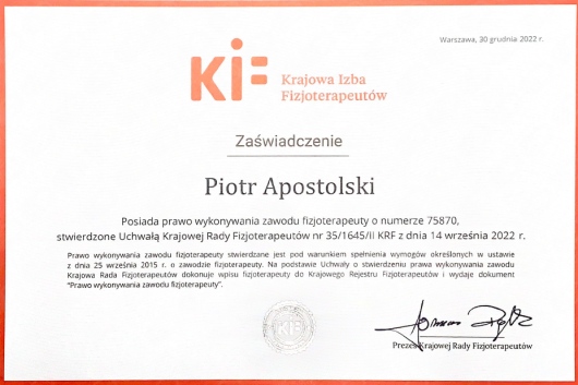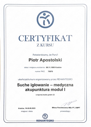 Miałem przyjemność obserwować progres Piotra już od etapu stażysty i nie znam szybciej rozwijającego się fizjoterapeuty. Zaangażowany, komunikatywny, już doświadczony i podchodzący do każdego przypadku indywidualnie. Najbardziej imponuje jego ciągły głód wiedzy oraz elastyczne podejście do ćwiczeń, które stale i na bieżąco dopasowuje do potrzeb pacjenta. Mgr Apostolski to przyszłość krakowskiej fizjoterapii.