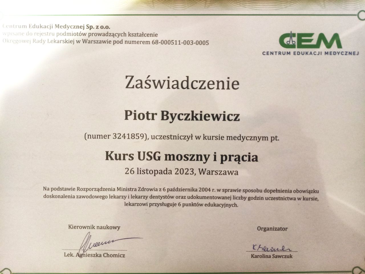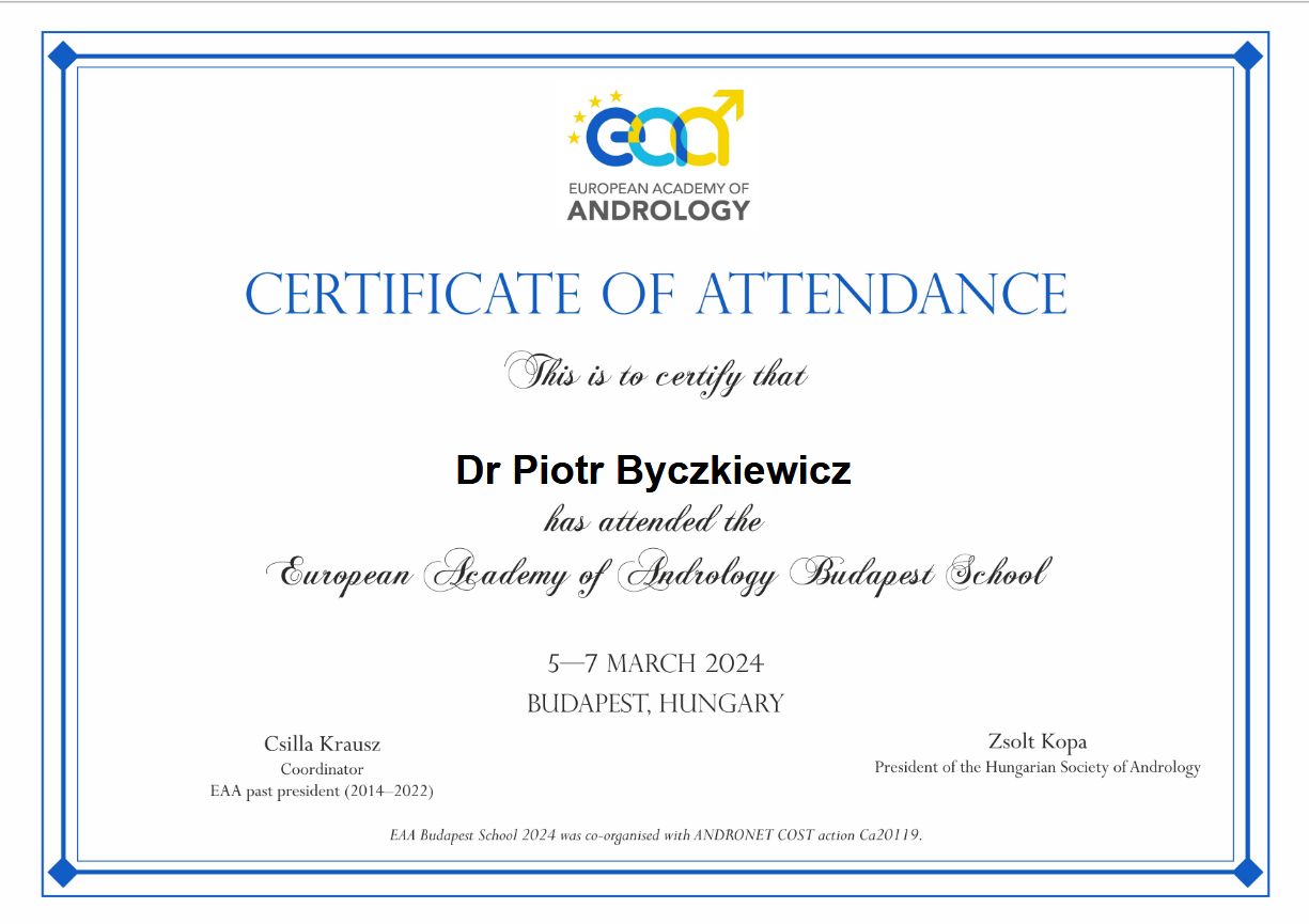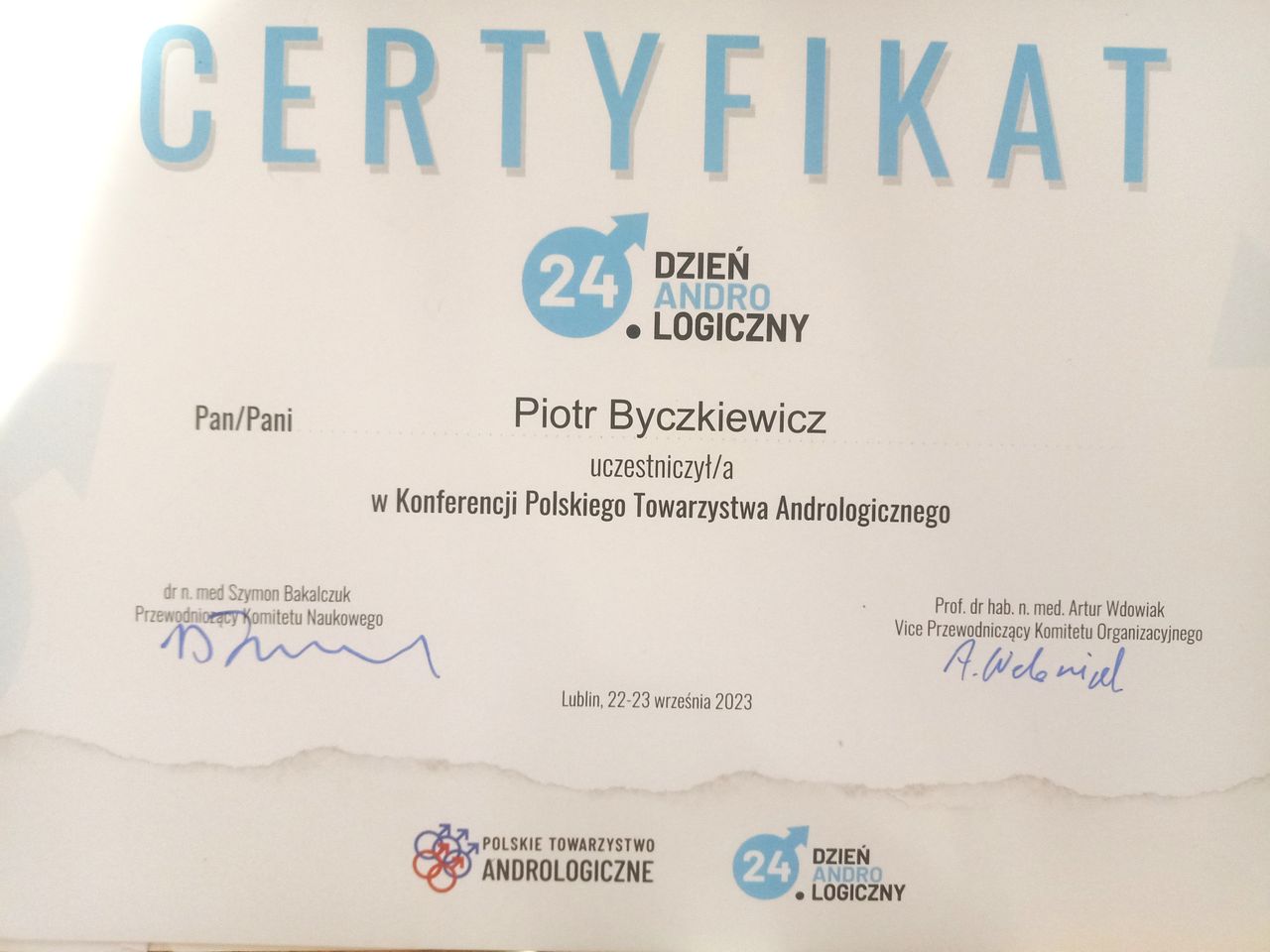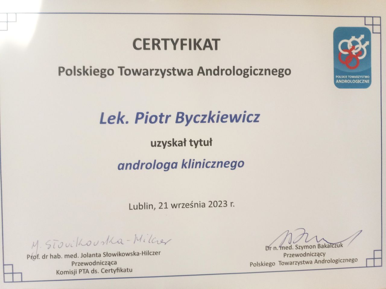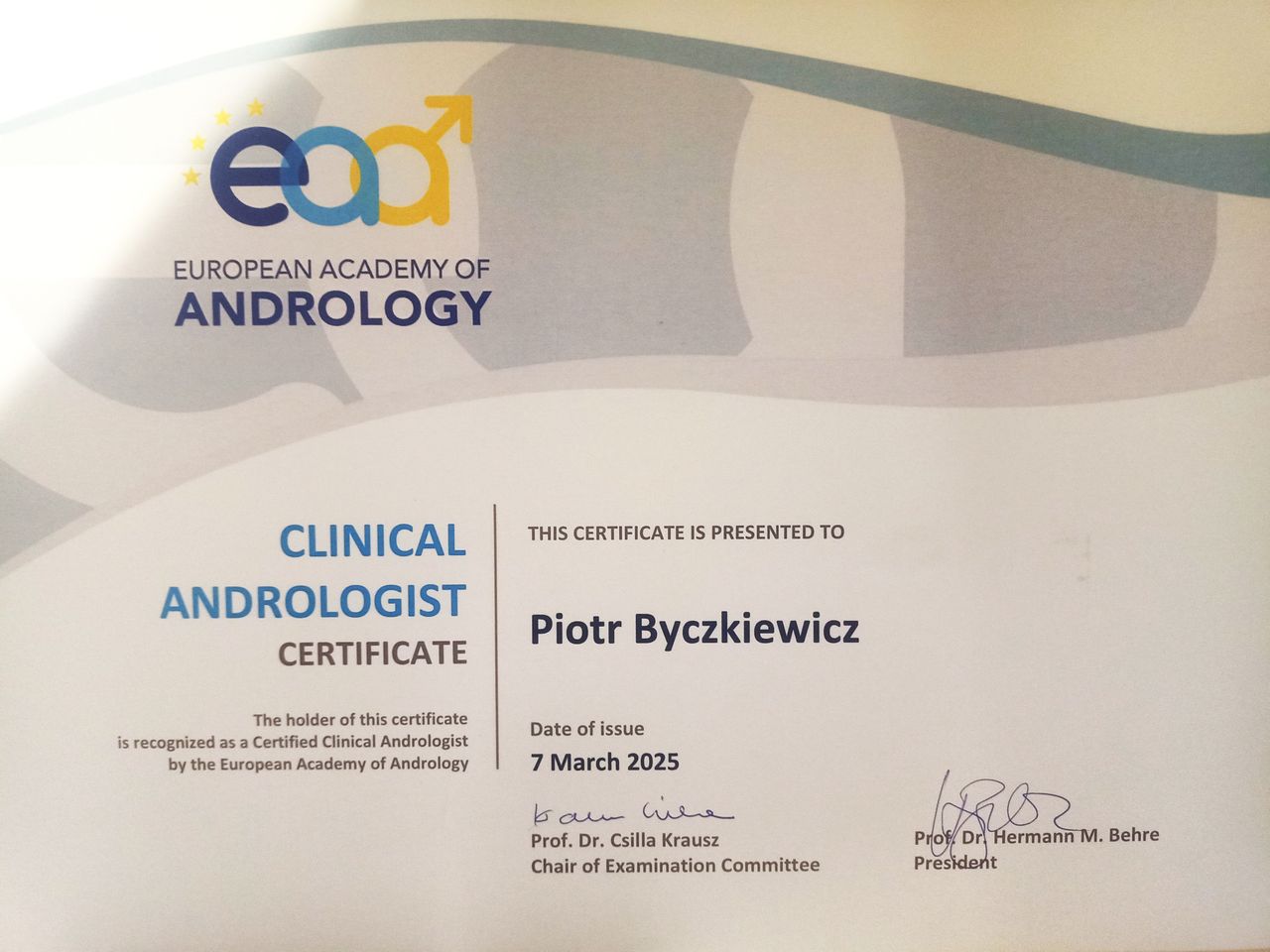 Androlog Kliniczny z certyfikatem Polskiego Towarzystwa Andrologicznego oraz Europejskiej Akademii Andrologii.