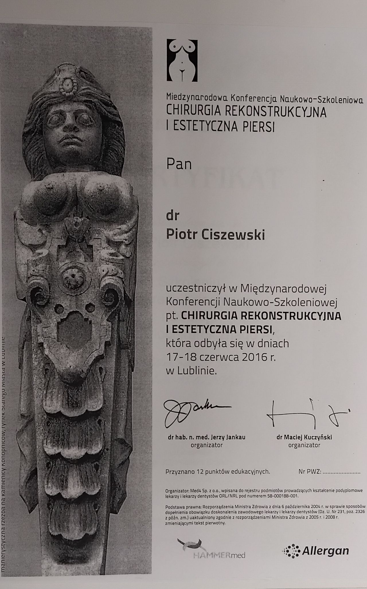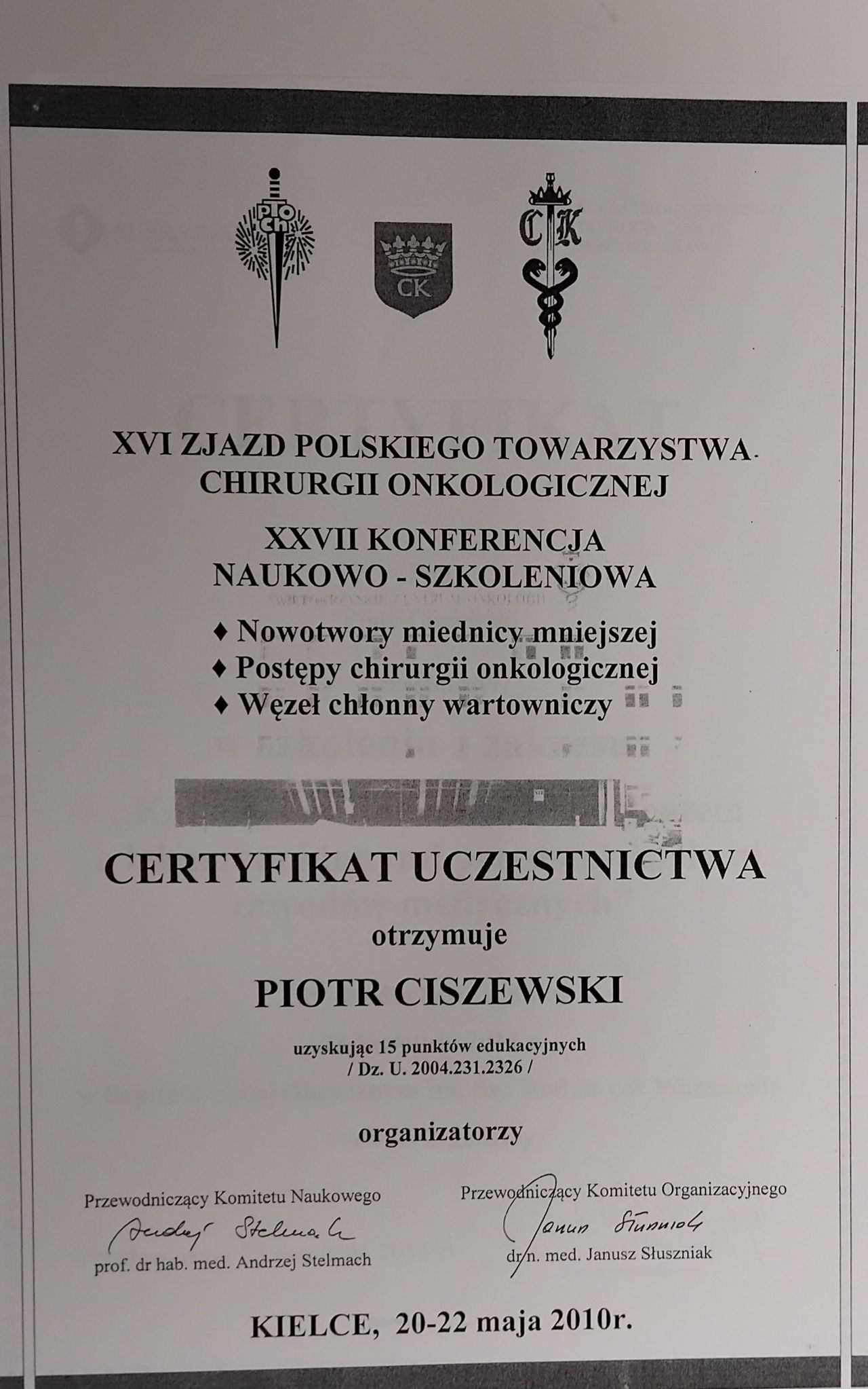 Dr Piotr Ciszewski - wielkiej klasy wspaniały chirurg o ogromnej wiedzy, perfekcji, profesjonalizmie, a do tego człowiek o wielkim sercu, empatii oraz przyjaznej i ujmującej osobowości. Oby tylko takich lekarzy spotykac na swojej drodze - ma się pewność, ze jest się w dobrych rękach, pod najlepszą opieką.