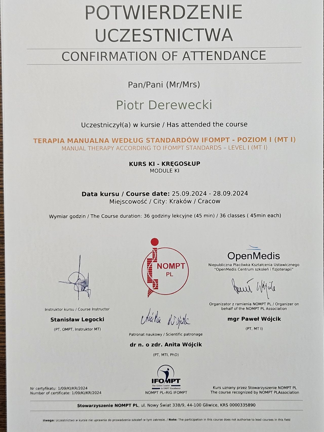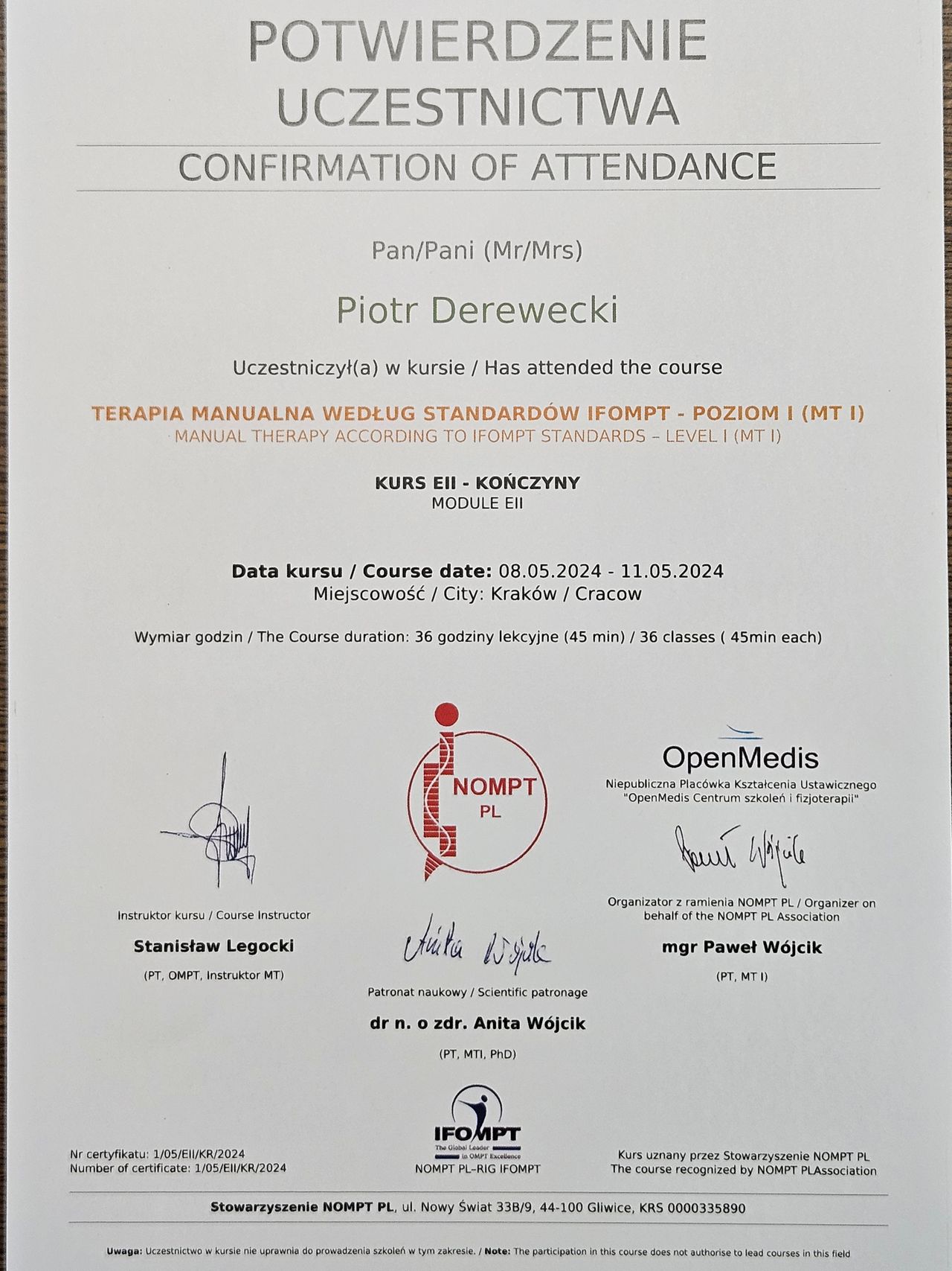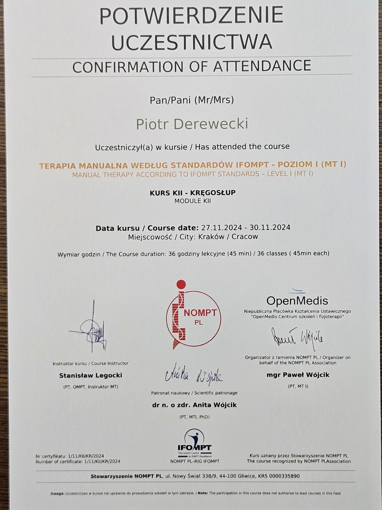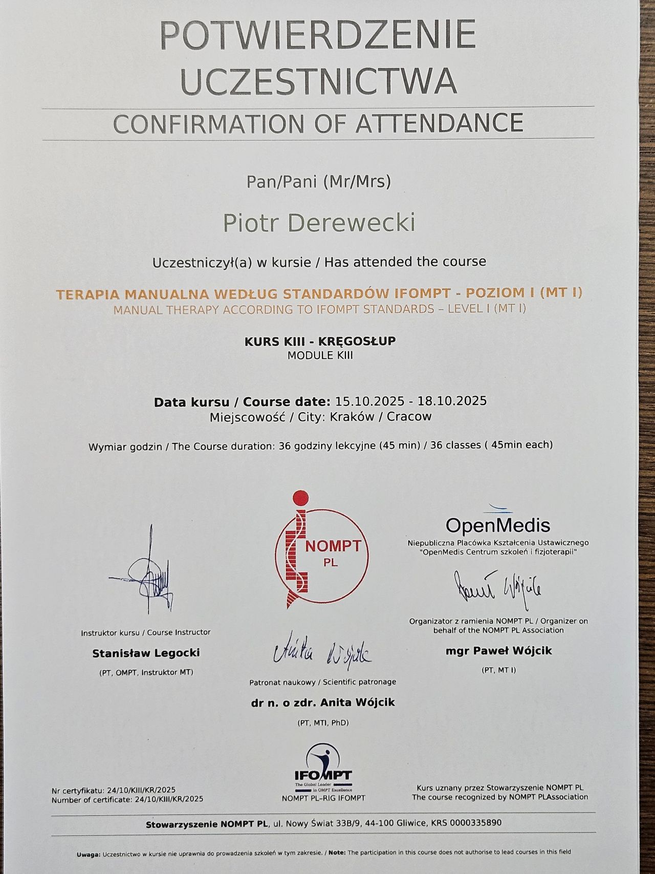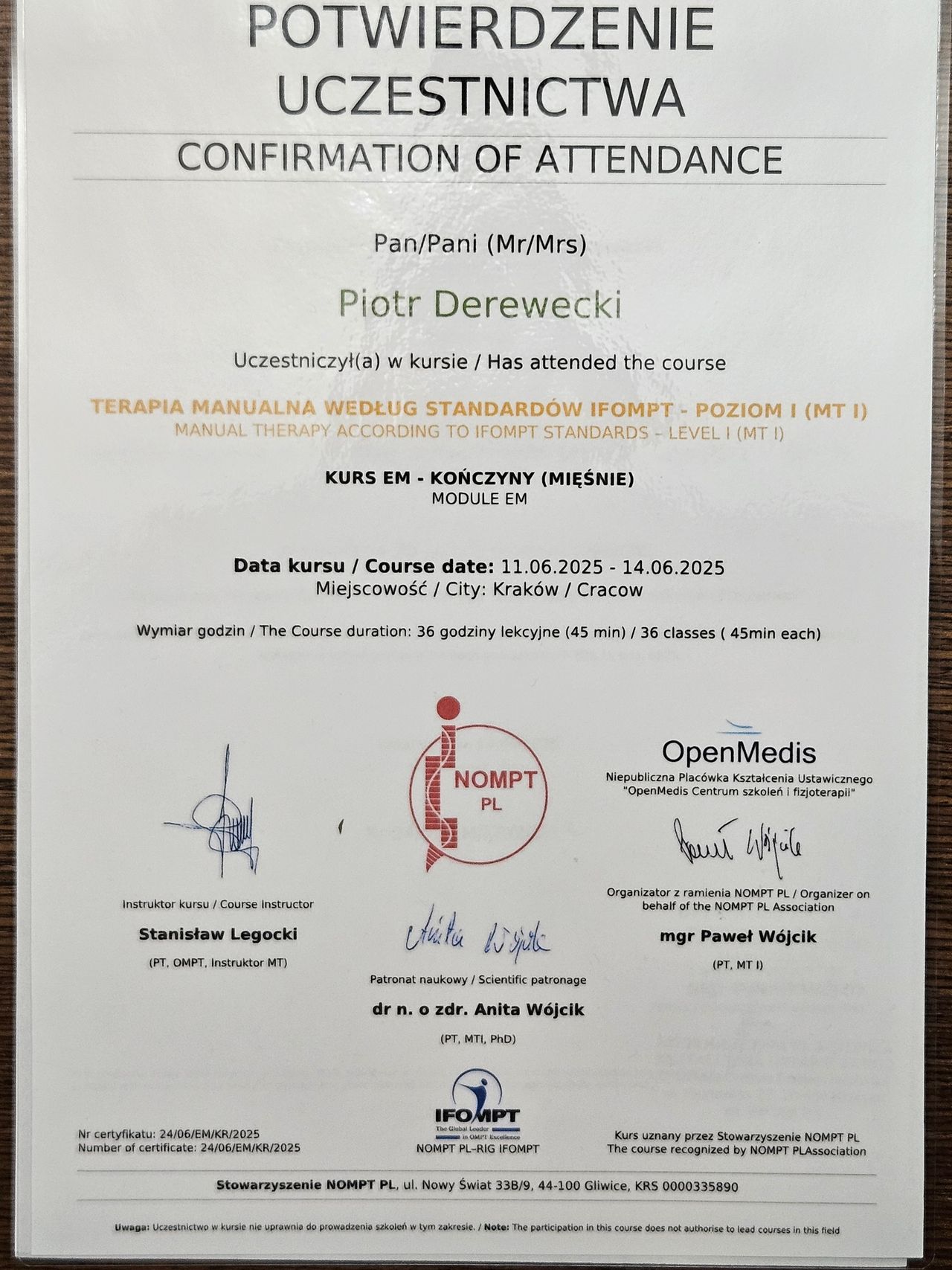 Stale rozwijam swoje kompetencje — ukończyłem kursy z terapii manualnej wg standardów IFOMPT, suchego igłowania, masażu tkanek głębokich i terapii punktów spustowych.
