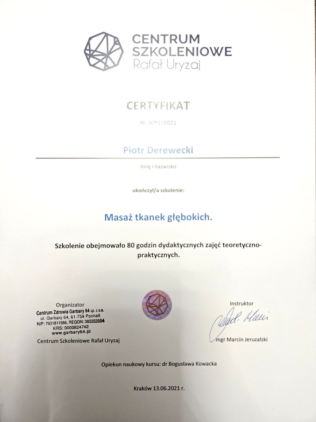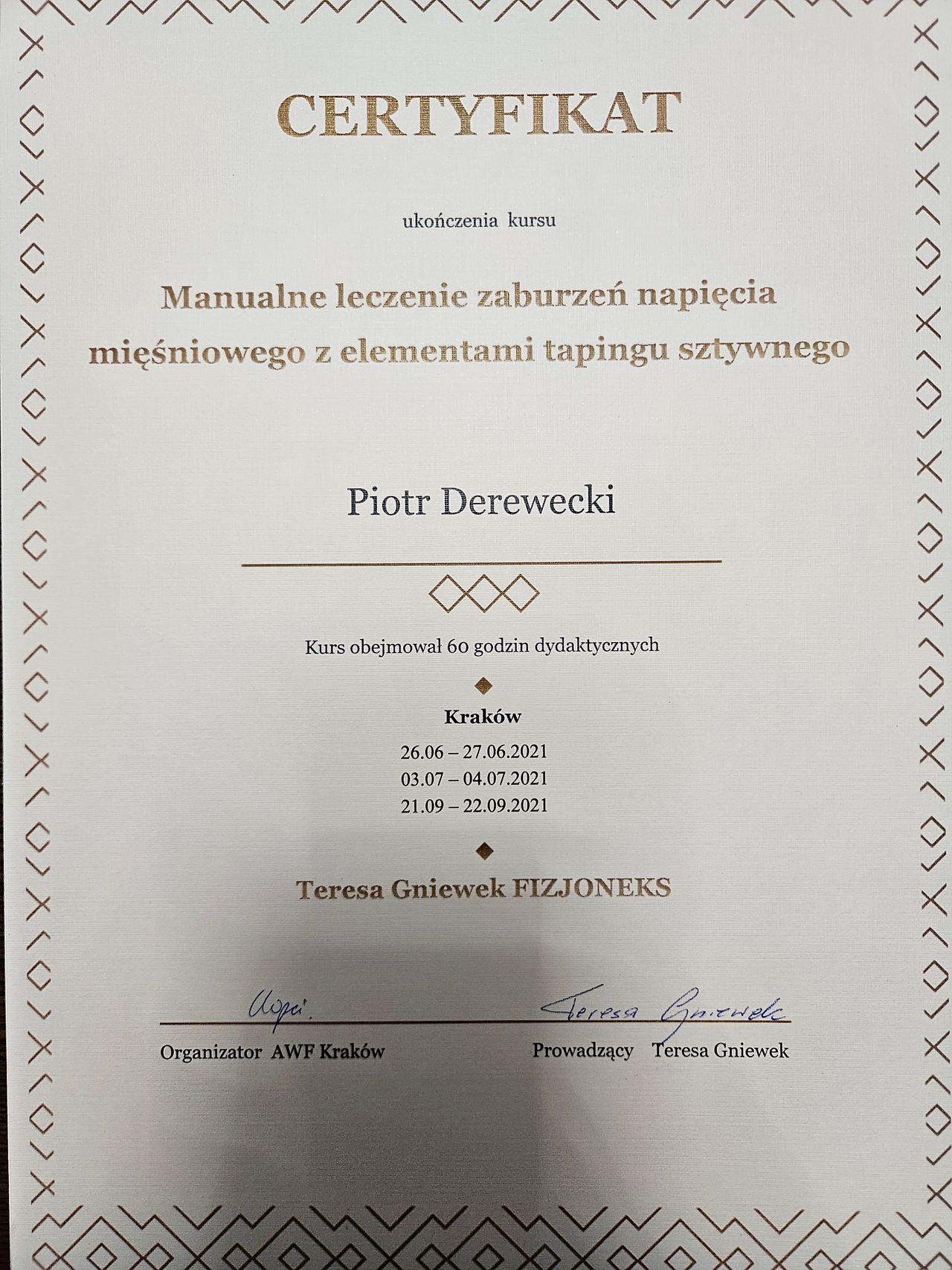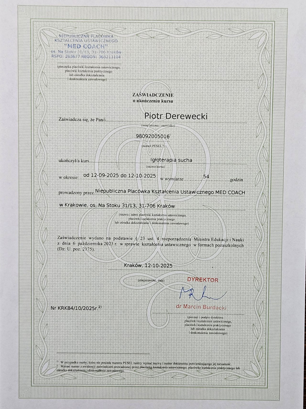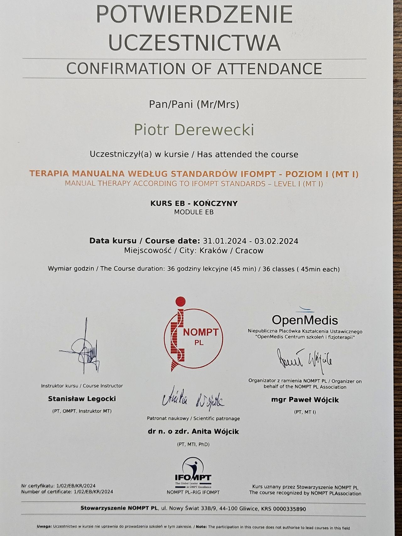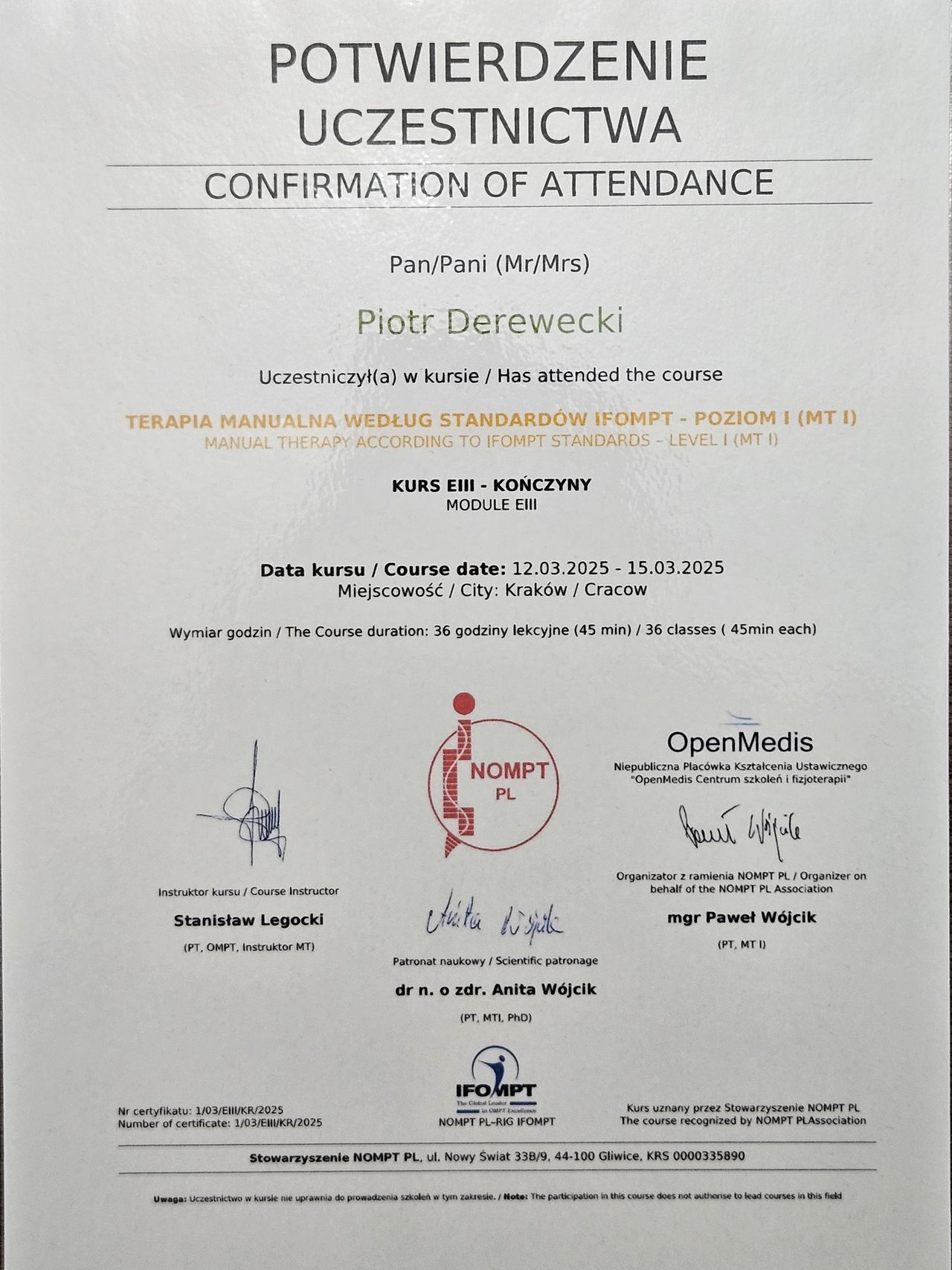 Stale rozwijam swoje kompetencje — ukończyłem kursy z terapii manualnej wg standardów IFOMPT, suchego igłowania, masażu tkanek głębokich i terapii punktów spustowych.