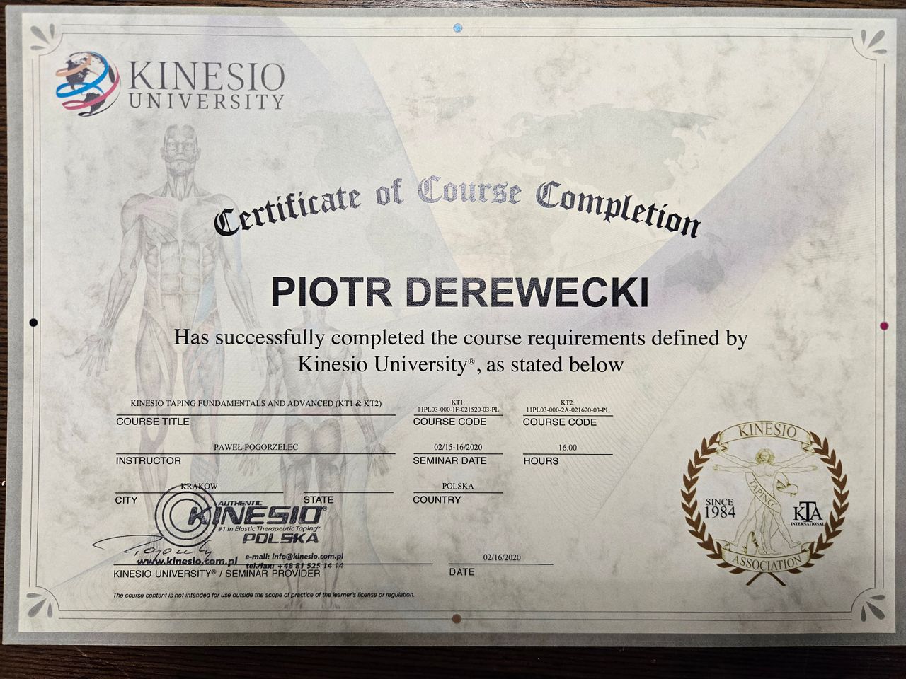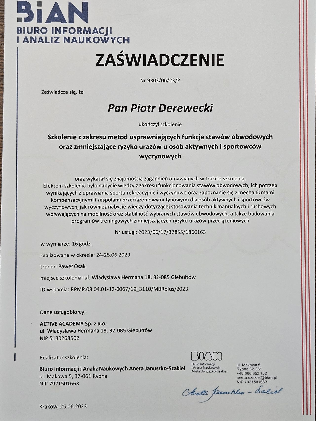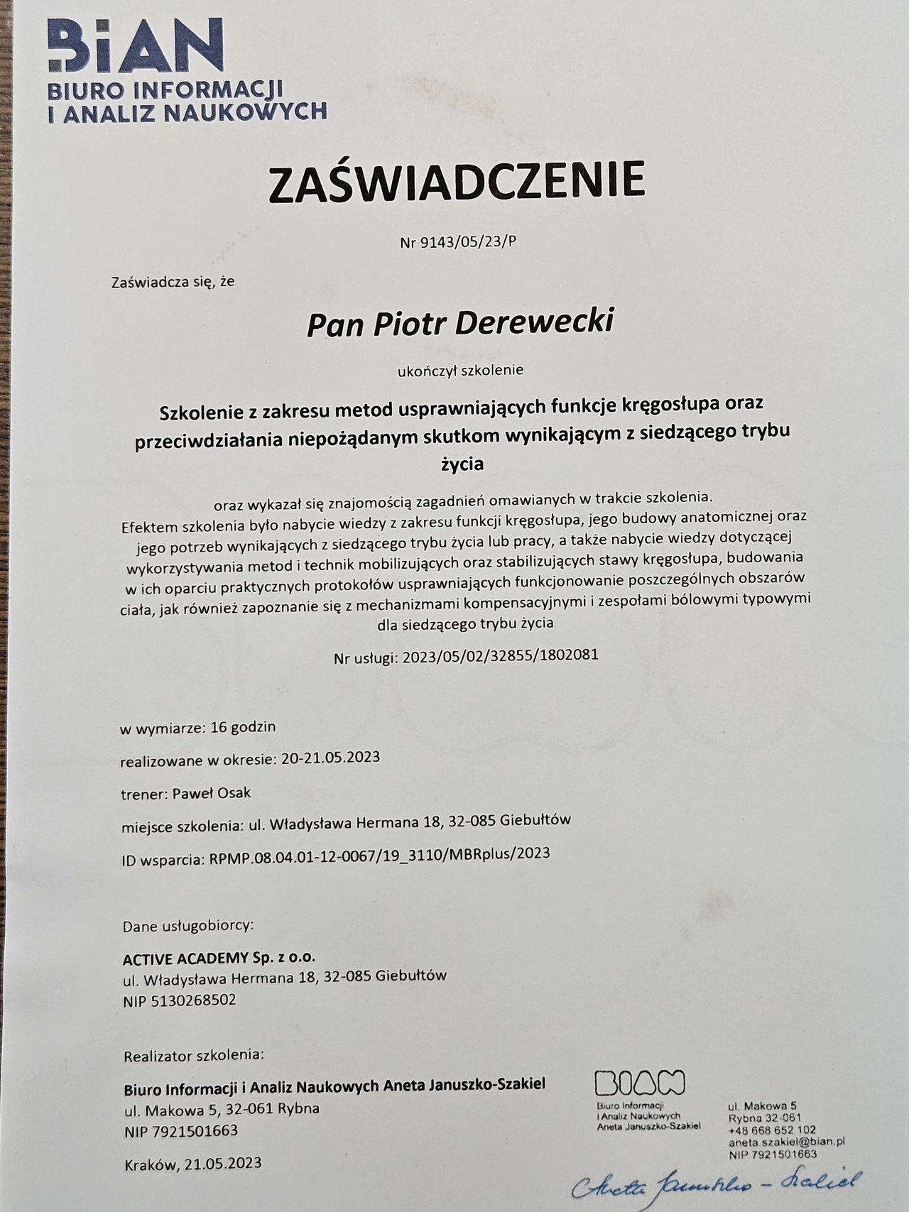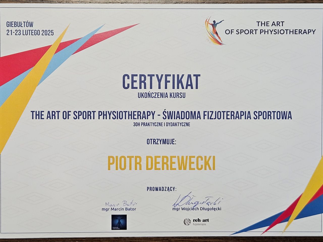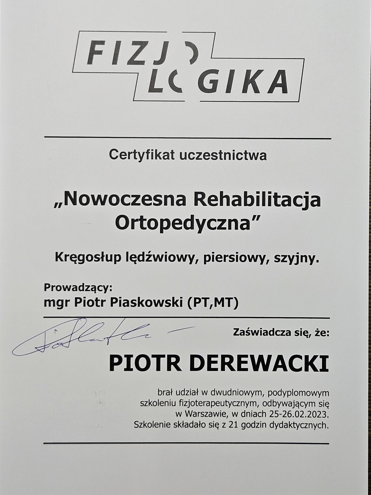 Stale rozwijam swoje kompetencje — ukończyłem kursy z terapii manualnej wg standardów IFOMPT, suchego igłowania, masażu tkanek głębokich i terapii punktów spustowych.