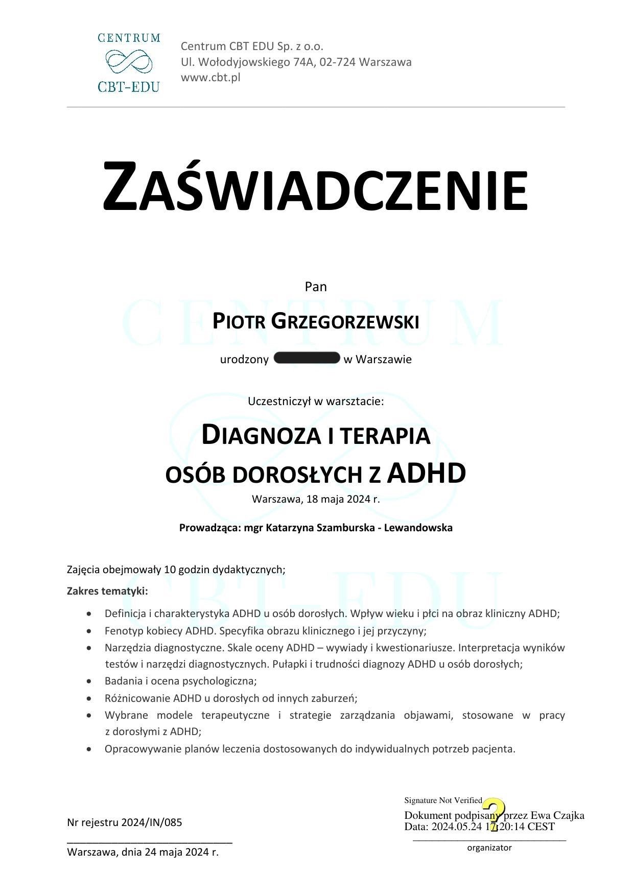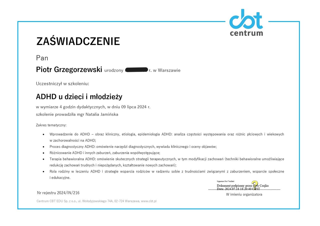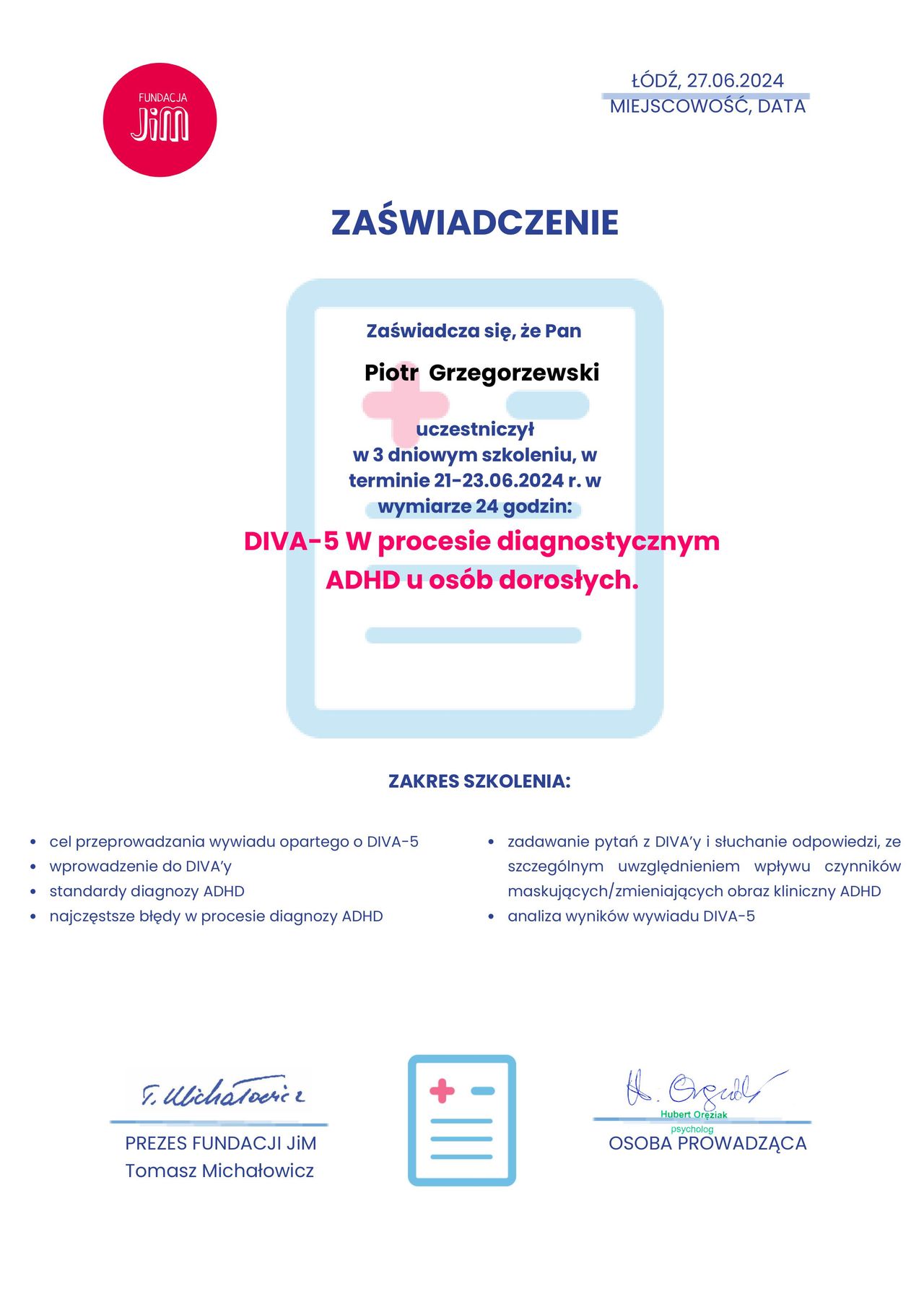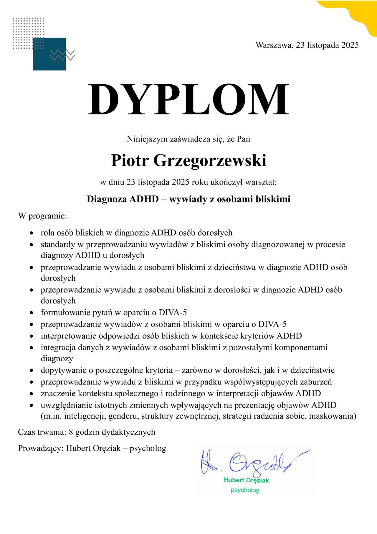 Jego diagnostyka jest bardzo szczegółowa i dokładna, zadaje odpowiednie pytania i jest bardzo sumienny. Oprócz tego bardzo empatyczny psycholog, szybko wzbudził moje zaufanie, czułem się przy nim dobrze. Dziękuję!• Pracownia Psychologiczna UL Diagnostyka Psychoterapia Psychiatria • diagnoza ADHD dla dorosłych •