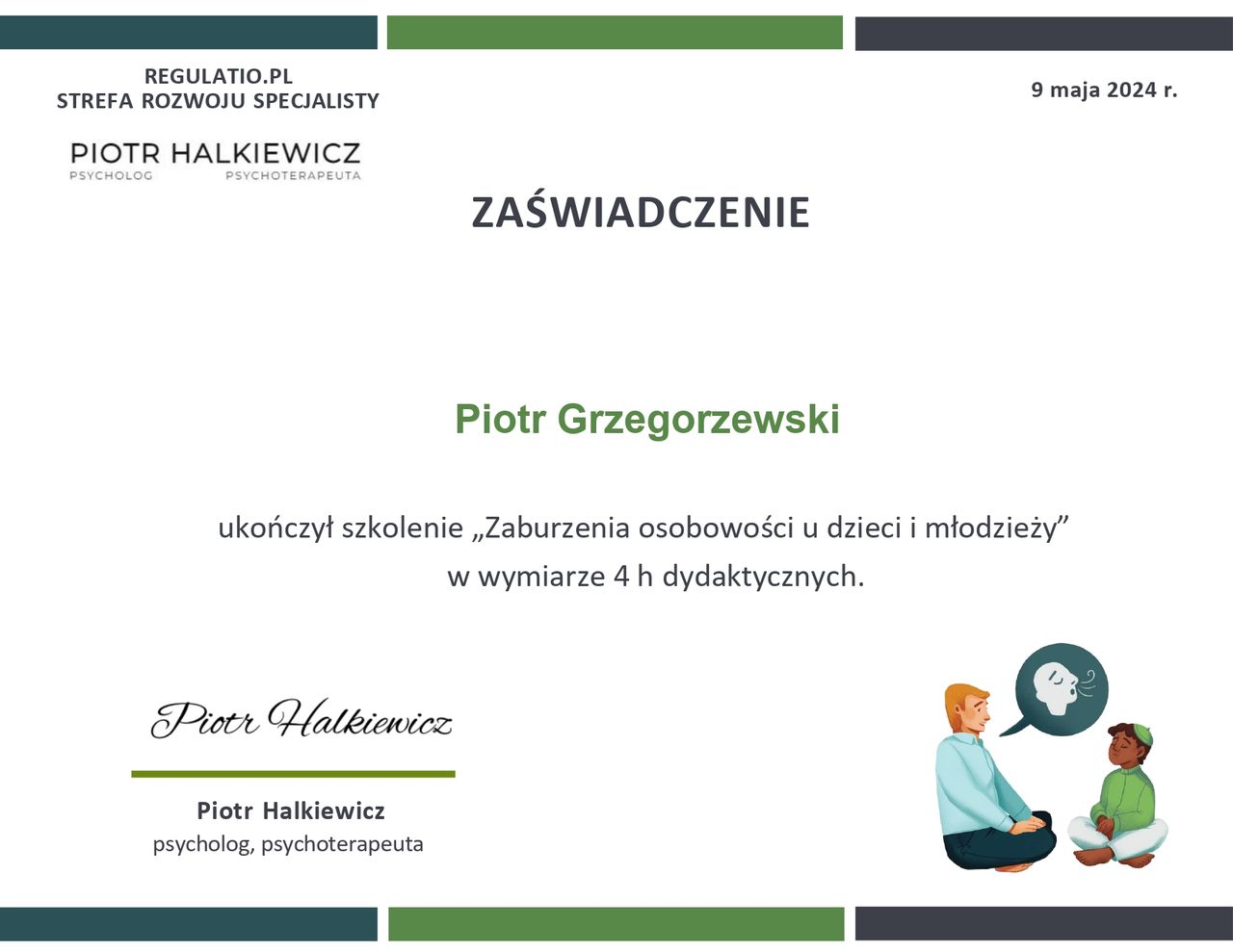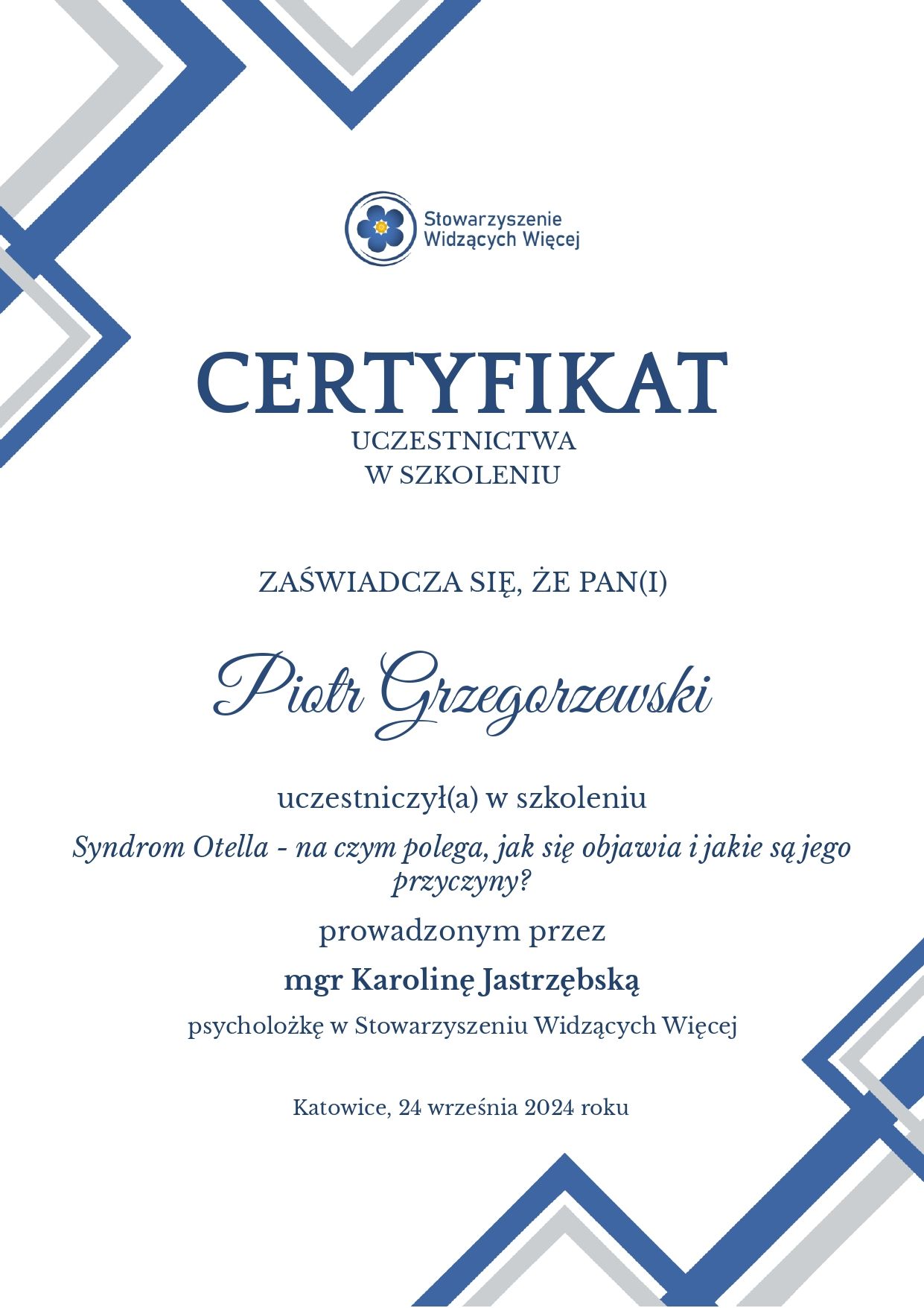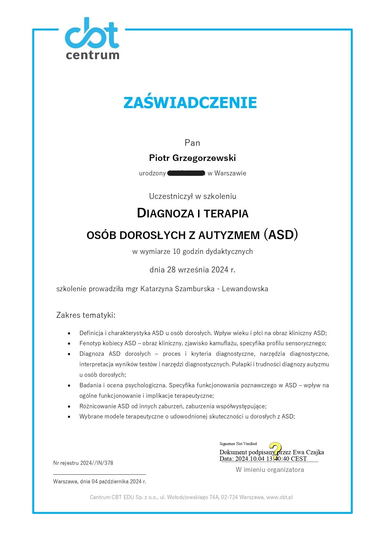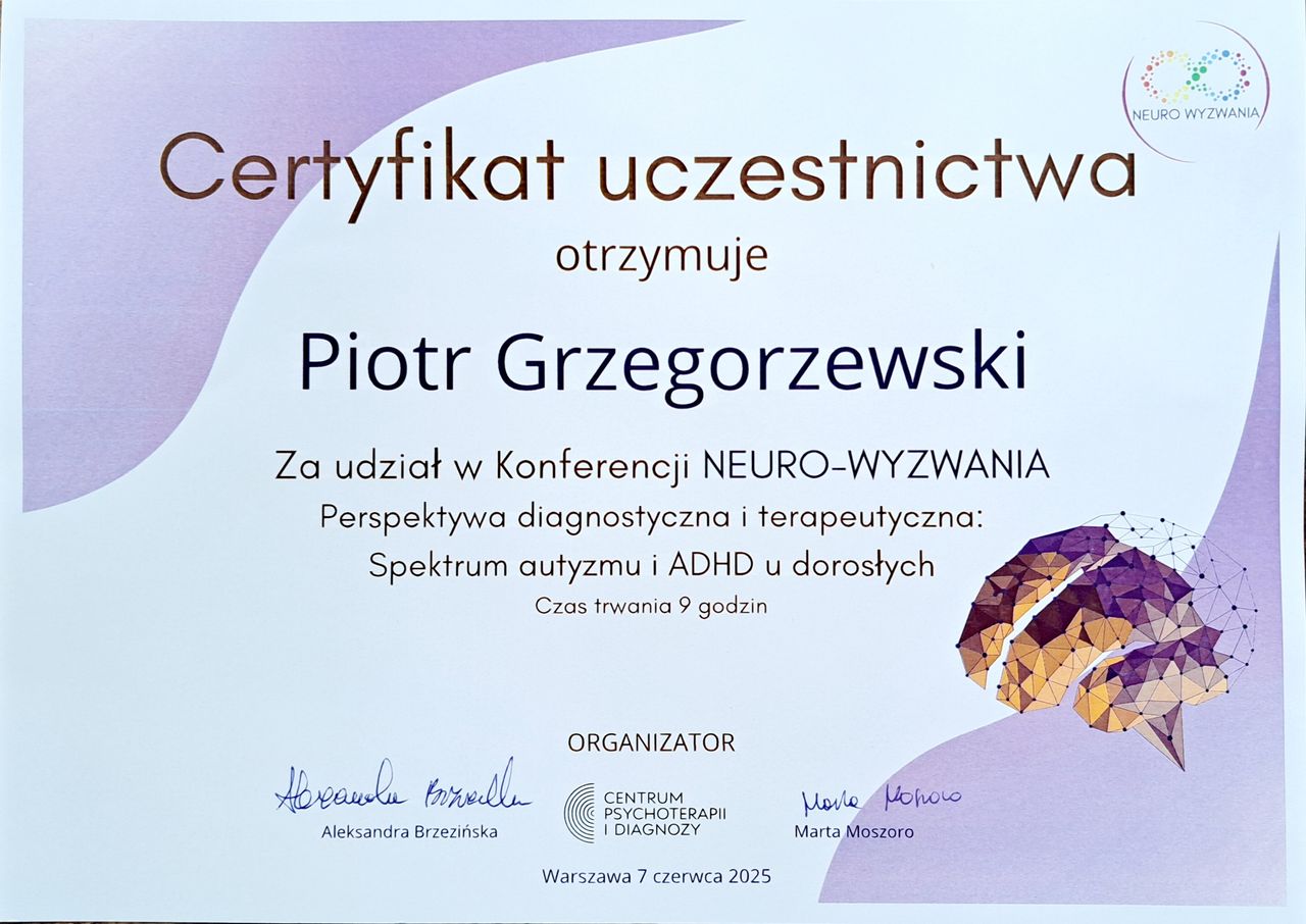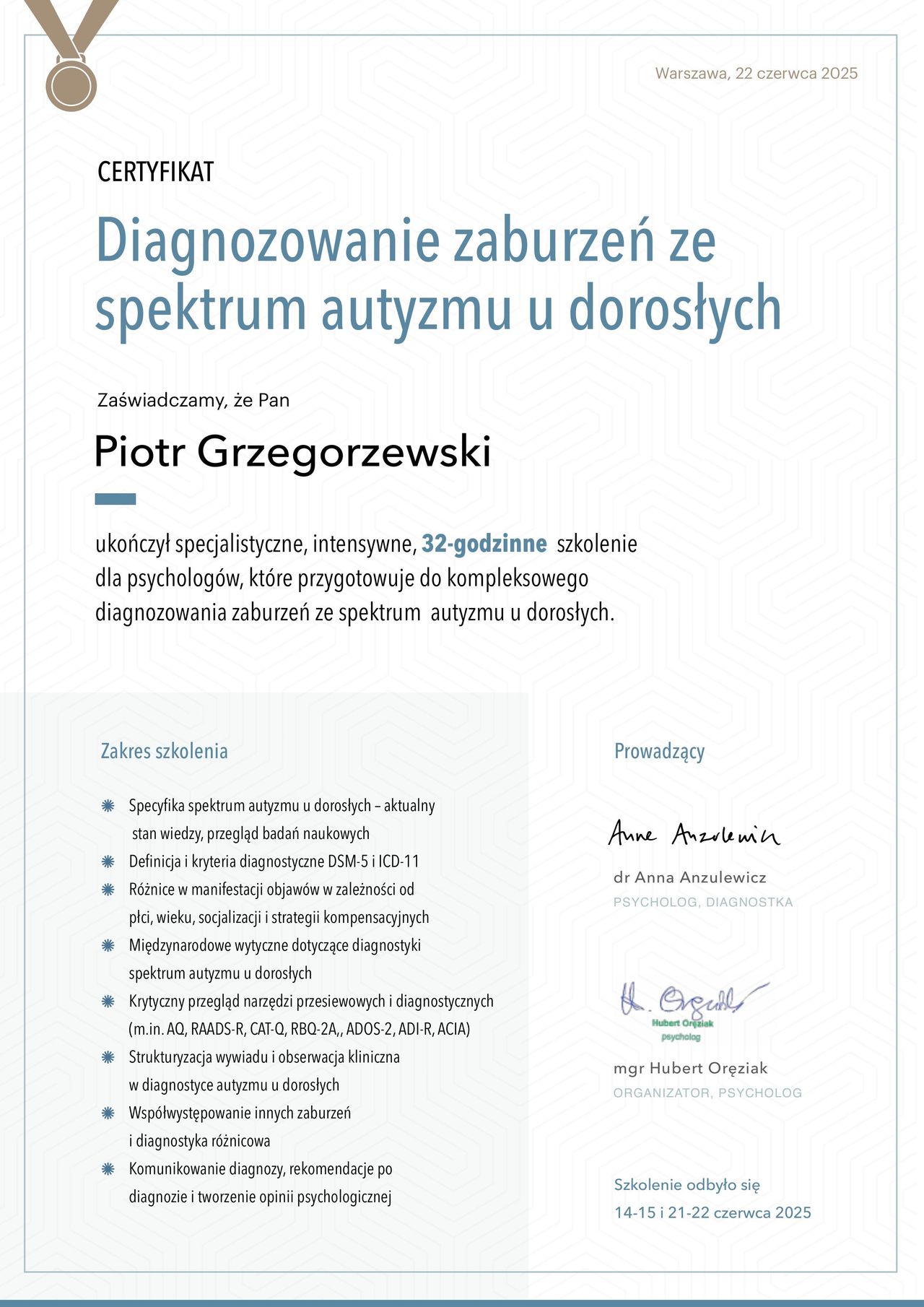 Jaki jest zakres porad oferowanych przez Piotr Grzegorzewski?Piotr Grzegorzewski to psycholog. Na podstawie swojego doświadczenia i wykształcenia Piotr Grzegorzewski oferuje usługi takie jak: konsultacja diagnostyczna, diagnoza zaburzeń osobowości, diagnoza ADHD dla dorosłych, Diagnoza autyzmu, Diagnoza cPTSD, badanie kwestionariuszem DIVA-5, Test SCID-5- zaburzenia osobowości.