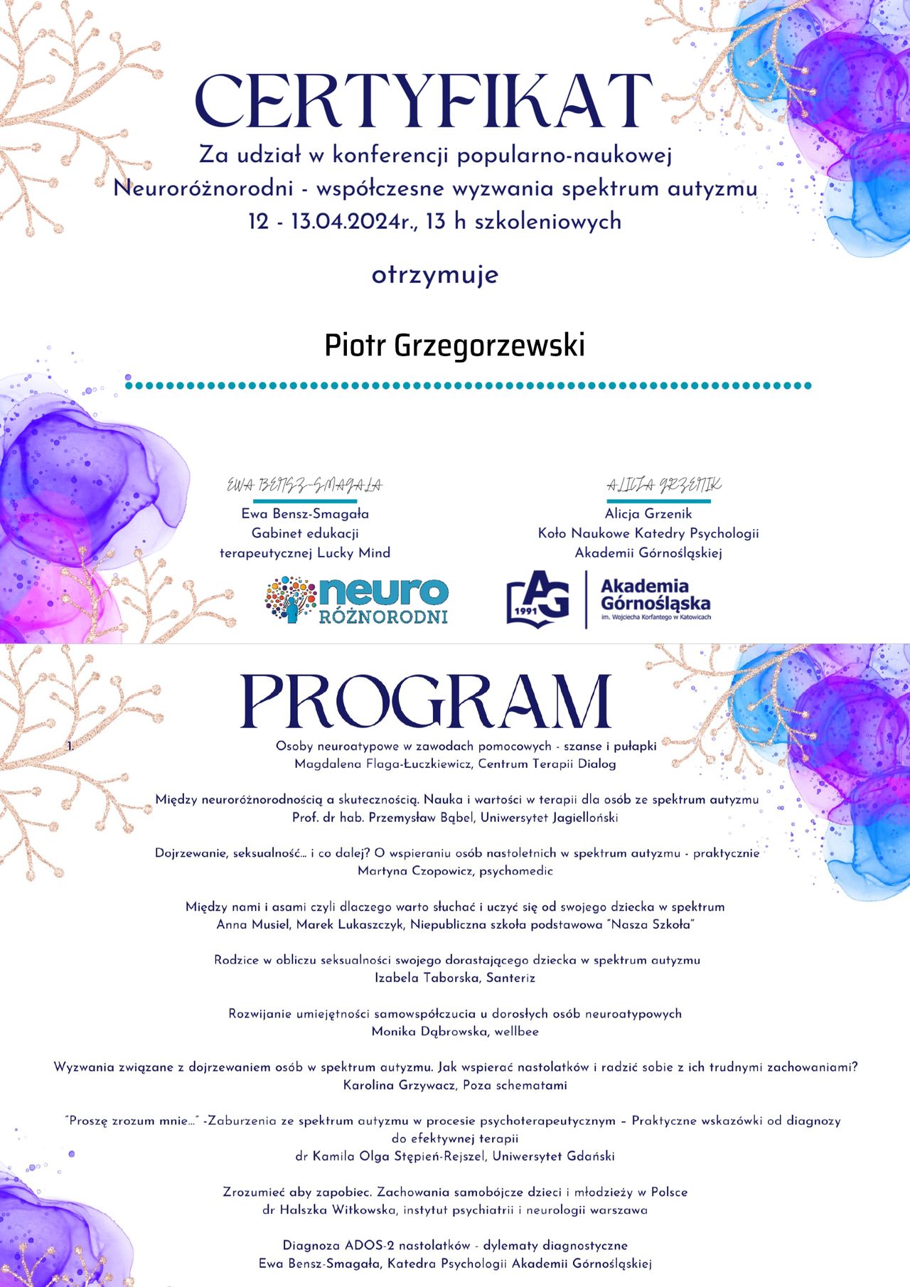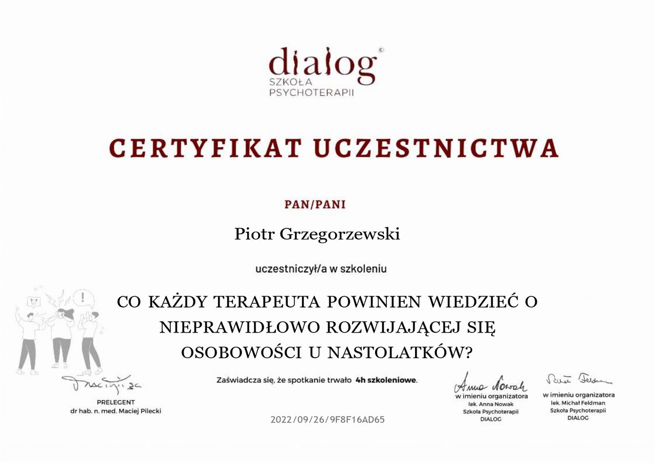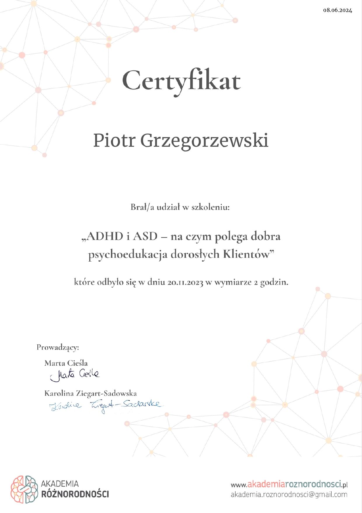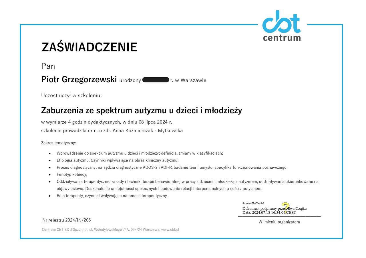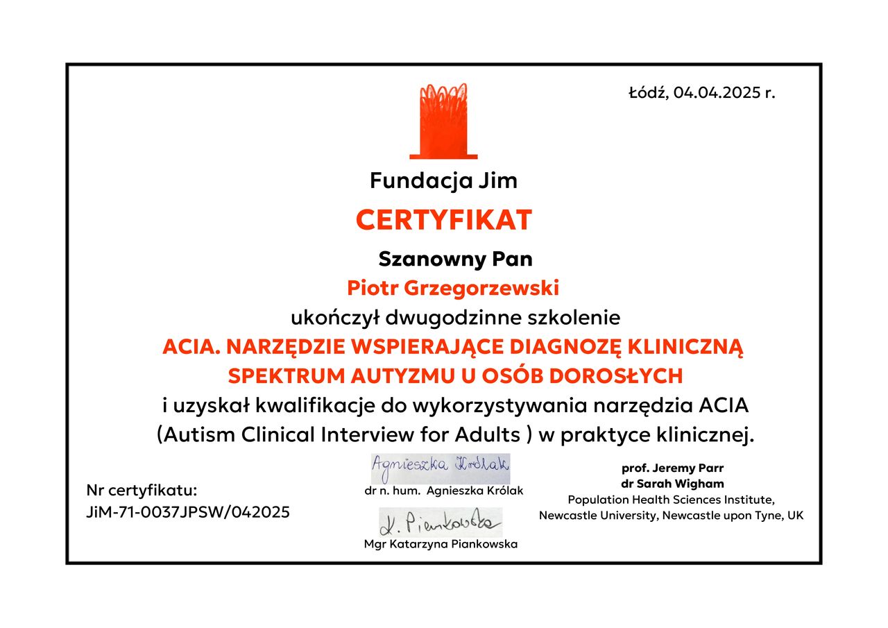 Jaki jest zakres porad oferowanych przez Piotr Grzegorzewski?Piotr Grzegorzewski to psycholog. Na podstawie swojego doświadczenia i wykształcenia Piotr Grzegorzewski oferuje usługi takie jak: konsultacja diagnostyczna, diagnoza zaburzeń osobowości, diagnoza ADHD dla dorosłych, Diagnoza autyzmu, Diagnoza cPTSD, badanie kwestionariuszem DIVA-5, Test SCID-5- zaburzenia osobowości.