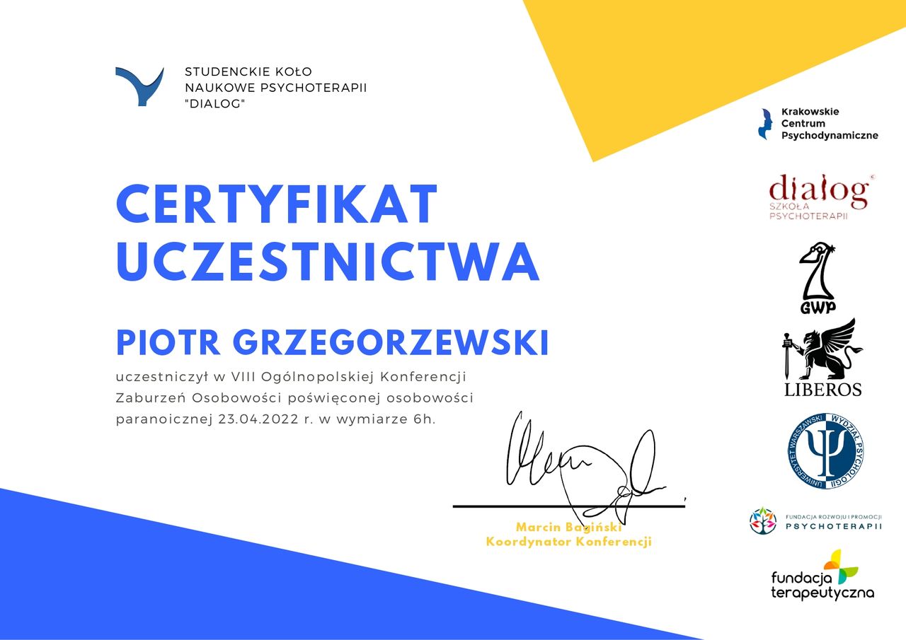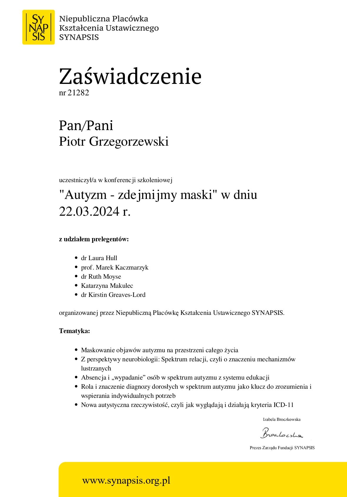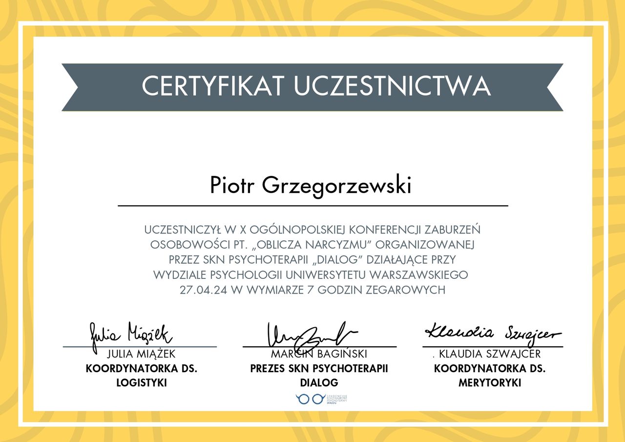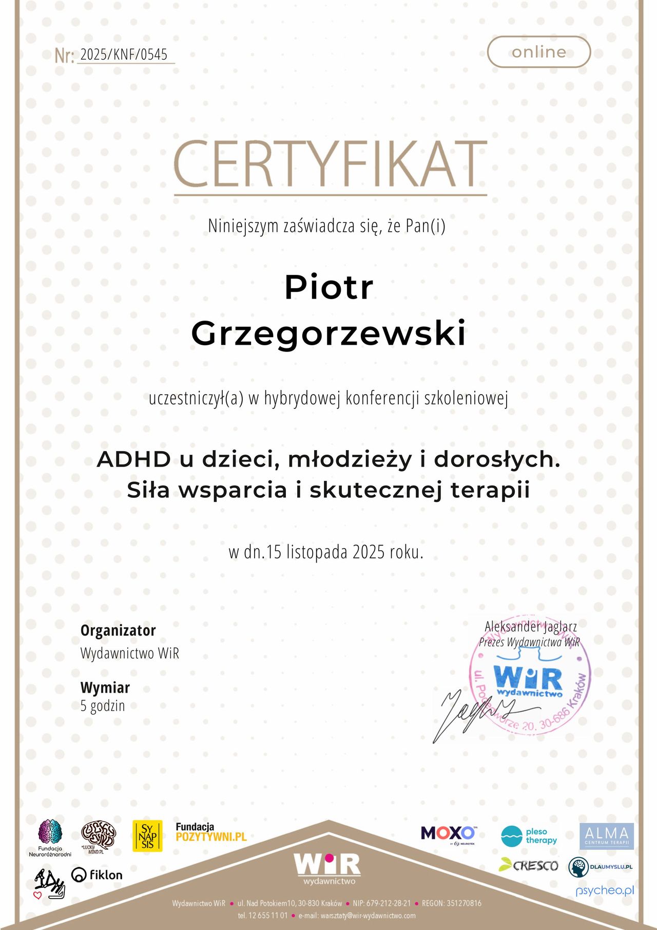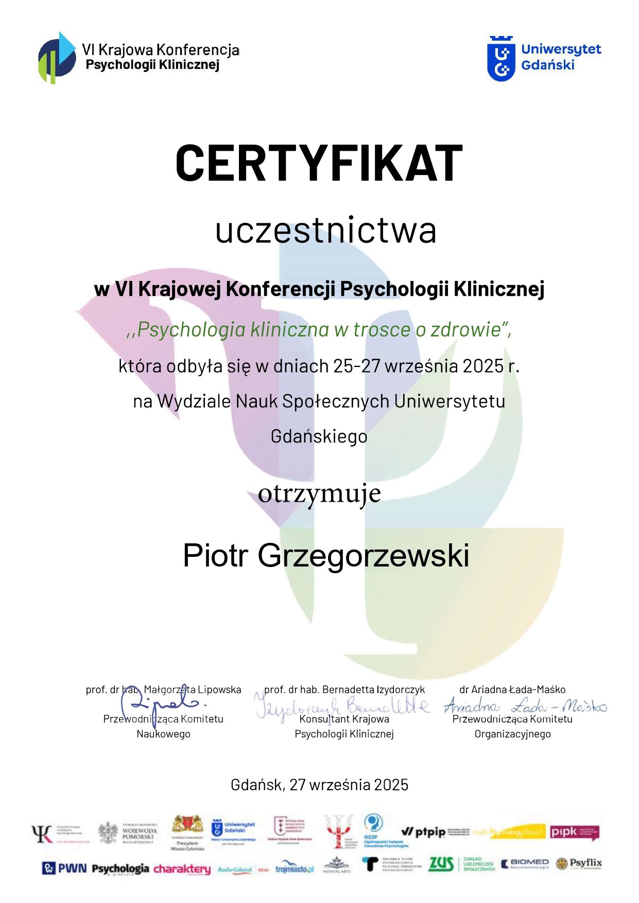 Czy Piotr Grzegorzewski przyjmuje online, bez konieczności pojawiania się w placówce?Tak, Piotr Grzegorzewski oferuje konsultacje online. Wybierz opcję „konsultacja online” przy umawianiu wizyty, a zobaczysz dostępne terminy.
