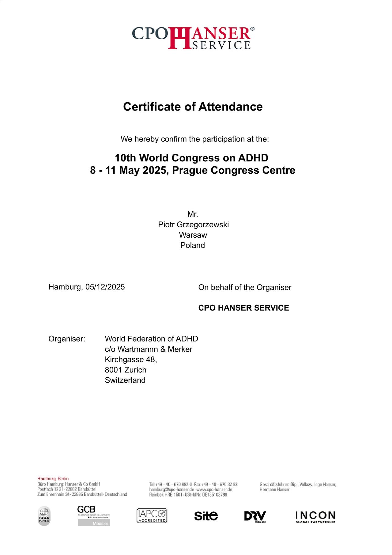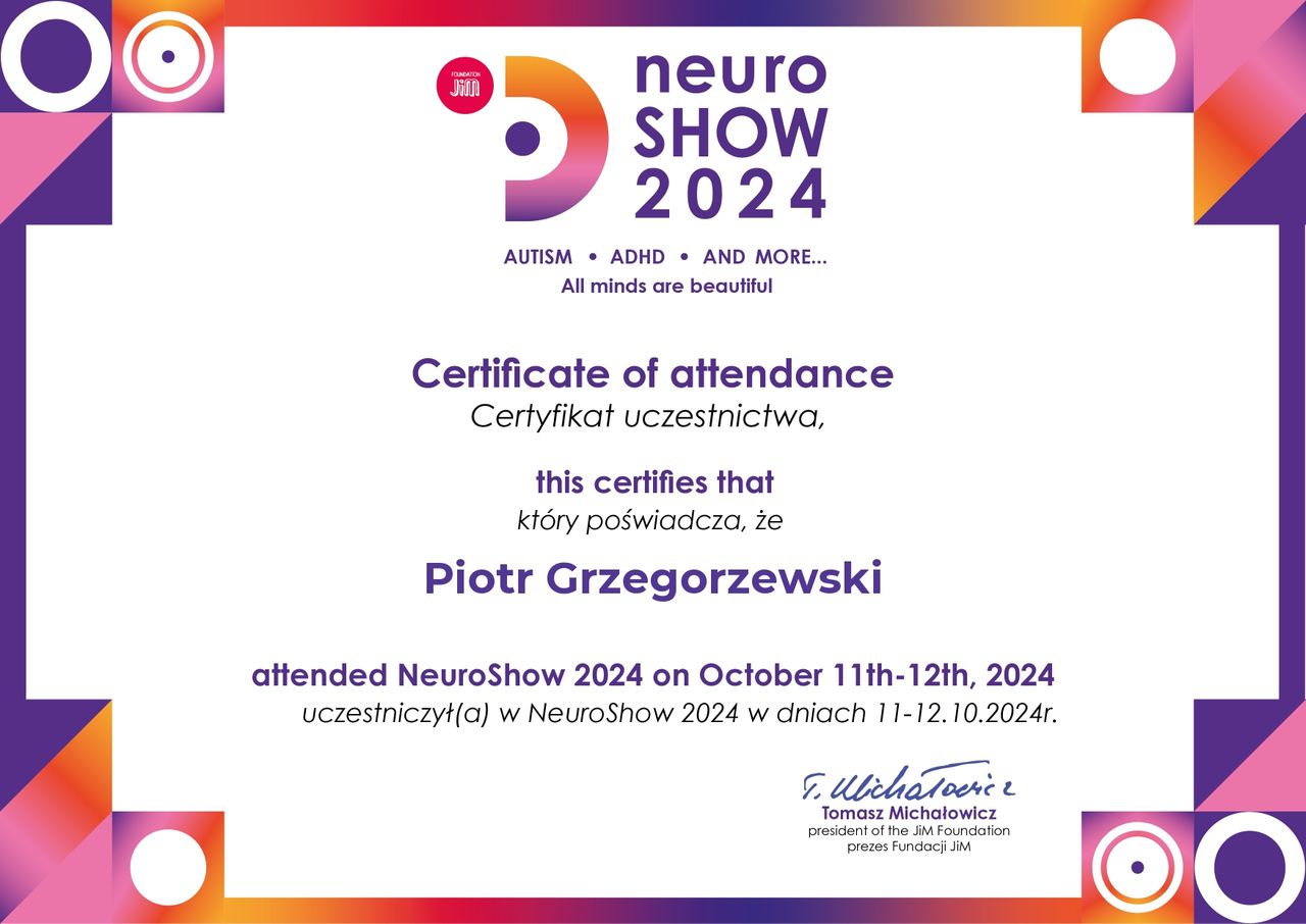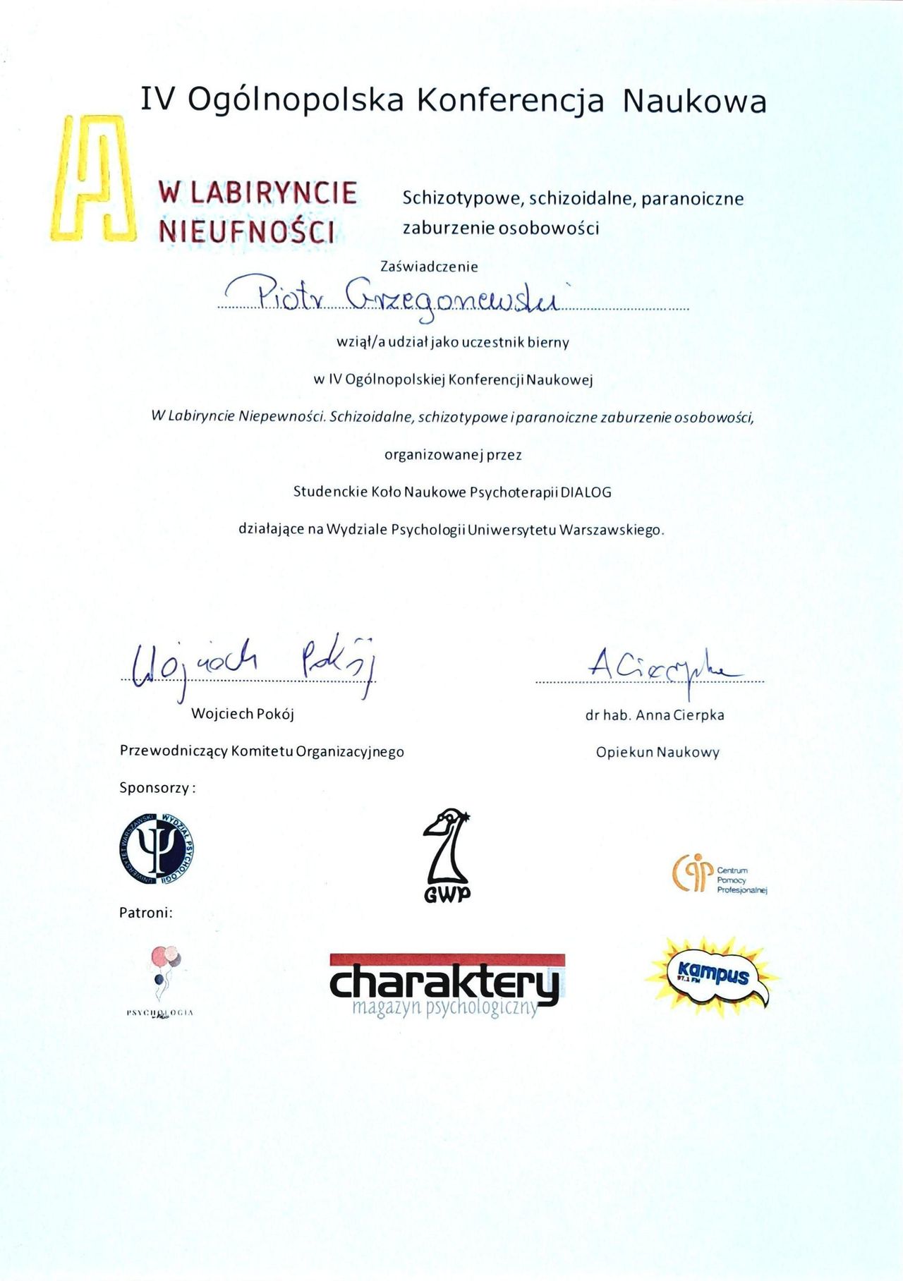 Jako student psychologii uzyskałem stypendium Amerykańskiego Departamentu Edukacji i Komisji Europejskiej na odbycie semestru studiów na Uniwersytecie Marshalla (Huntington, WV, USA). Należę do: Europejskiego Towarzystwa Badań nad Zaburzeniami Osobowości, Europejskiego Towarzystwa Traumy i Dysocjacji oraz Światowej Federacji ADHD.
