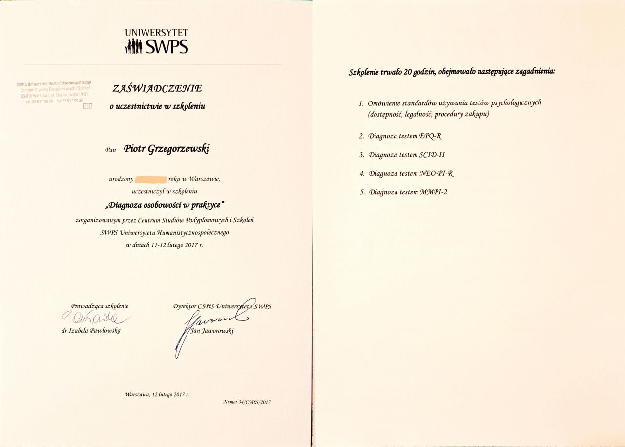 Jako diagnosta mam doświadczenie kliniczne od 2016 r. (w IPiN oraz trzech prywatnych przychodniach psychoterapeutycznych i ośrodku terapeutycznym).