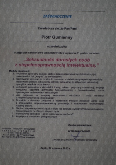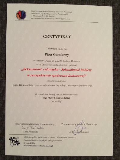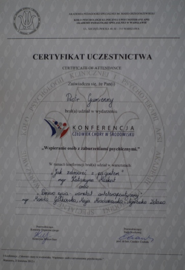 Regularnie uczestniczę w konferencjach naukowych, szkoleniach oraz warsztatach przygotowujących do pracy z osobami z zaburzeniami psychicznymi oraz seksualnymi.