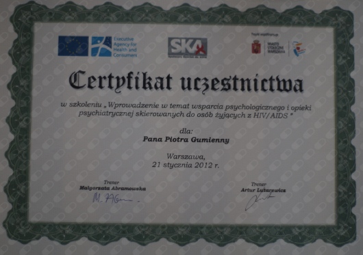 Ukończyłem 4-letni kurs psychoterapii w Szkole Terapii Poznawczo - Behawioralnej Centrum CBT-EDU.