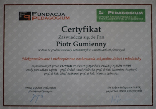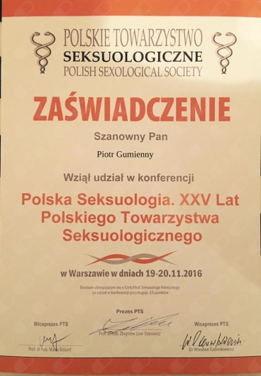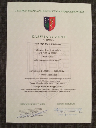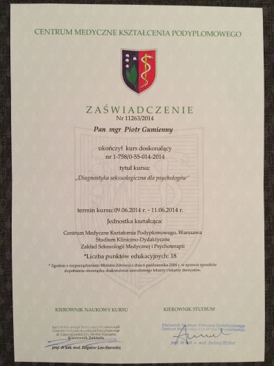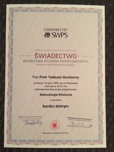 Ukończyłem studia podyplomowe z zakresu seksuologii klinicznej w Centrum Studiów Podyplomowych i Szkoleń SWPS - Uniwersytet Humanistycznospołeczny, akredytowanym przez Polskie Towarzystwo Seksuologiczne, uczestniczyłem w kursach doszkalających z zakresu seksuologii w Zakładzie Seksuologii Medycznej i Psychoterapii w Centrum Medycznym Kształcenia Podyplomowego.