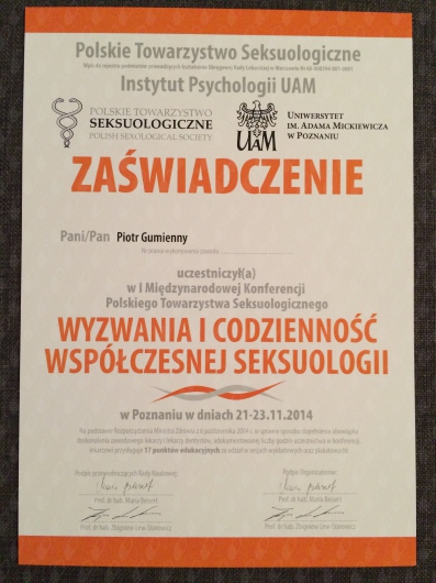 Moja praca jest objęta stałą superwizją u certyfikowanych przez Polskie Towarzystwo Seksuologiczne superwizorów.