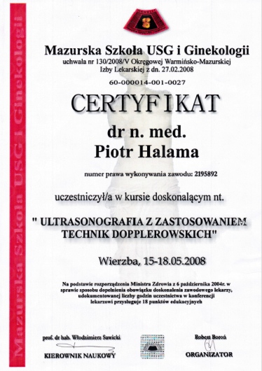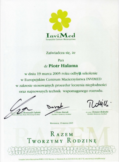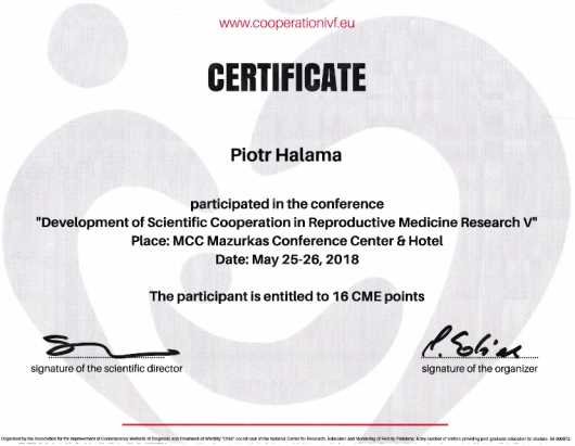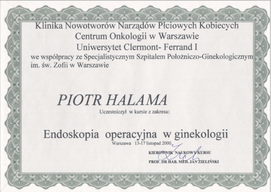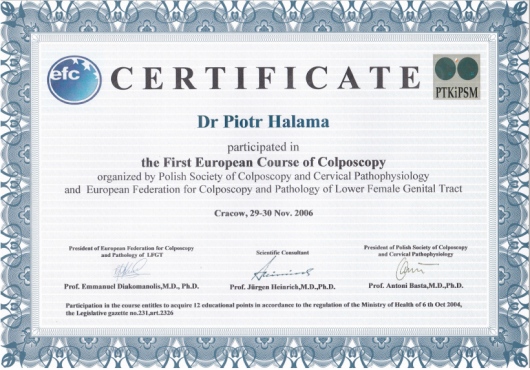 Posiadam liczne certyfikaty z zakresu endoskopii ginekologicznej, w tym certyfikat Uniwersytetu w Clermont-Ferrand oraz odbyłem staż kliniczny w Ośrodku Zapłodnienia Pozaustrojowego w Pradze, z którym współpracowałem do czasu powstania analogicznego ośrodka we Wrocławiu.
