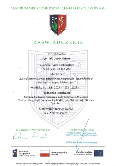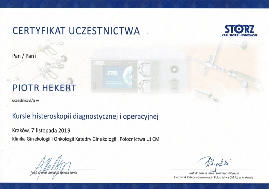 - Kurs histeroskopii diagnostycznej i operacyjnej, Klinika Ginekologii i Onkologii UJ CM, Kraków 07.11.2019
