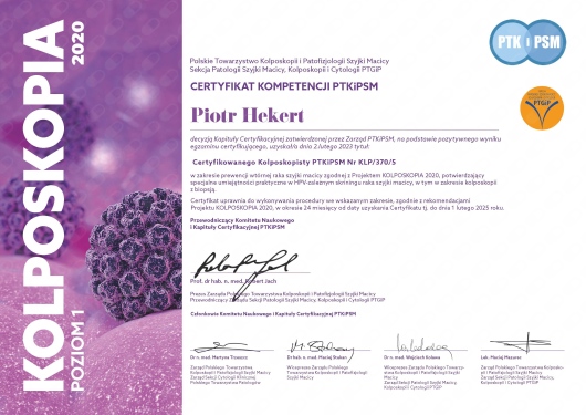Posiadam Certyfikat Kompetencji Polskiego Towarzystwa Kolposkopii i Patofizjologii Szyjki Macicy z tytułem certyfikowanego kolposkopisty PTKiPSM