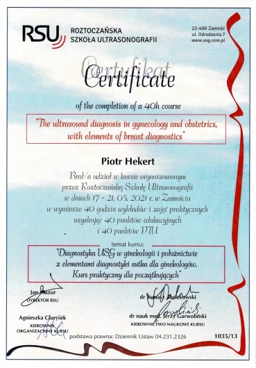 - Kurs „Roztoczańska Szkoła Ultrasonografii” – Diagnostyka USG w ginekologii i położnictwie z elementami diagnostyki sutka dla ginekologów, Zamość 17-21.05.2021