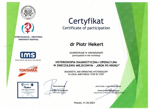 - Kurs histeroskopii diagnostycznej i operacyjnej w znieczuleniu miejscowym „krok po kroku” Poznań 21.04.2023