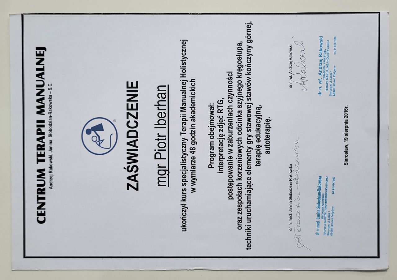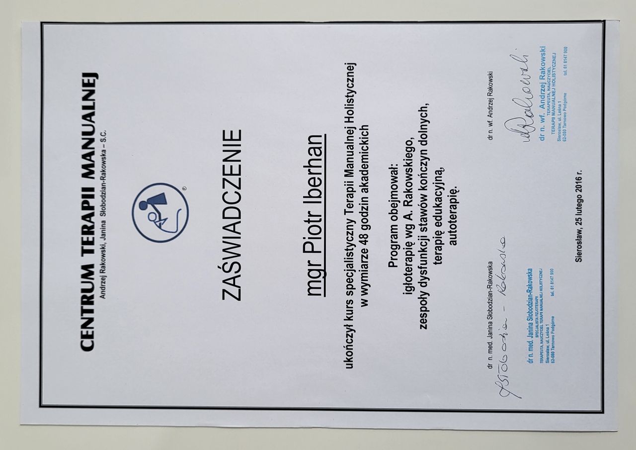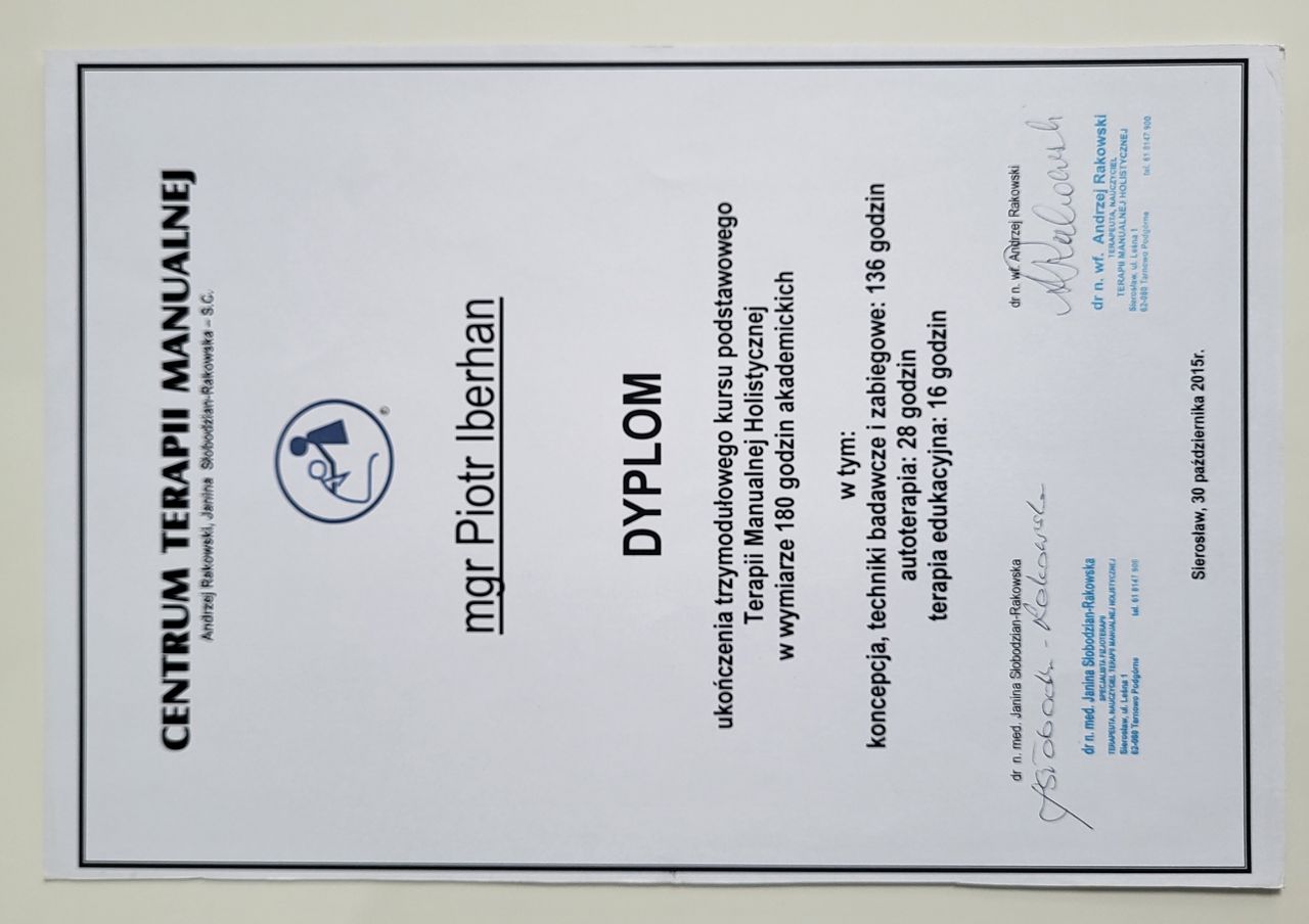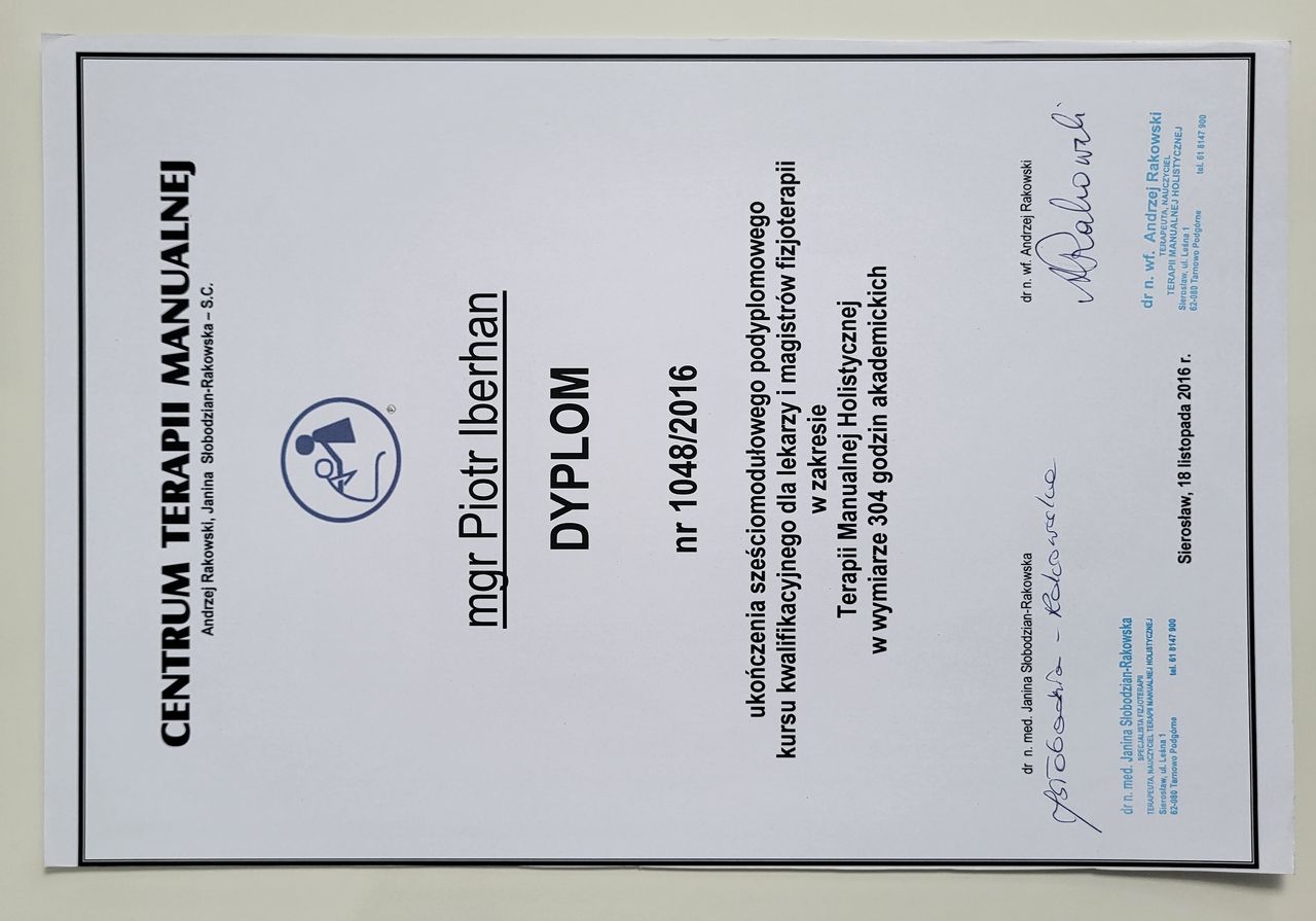 Nazywam się Piotr Iberhan. Jestem mgr fizjoterapii. Szereg ukończonych przeze mnie szkoleń i ciągle rozwijana wiedza umożliwia mi pracę z pacjentem w każdym wieku.