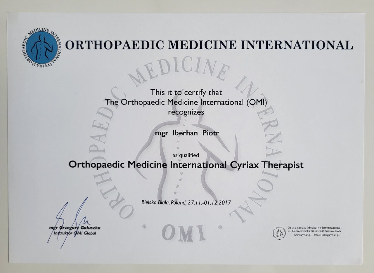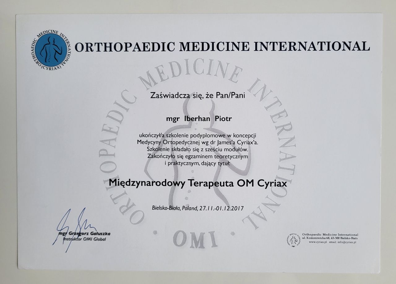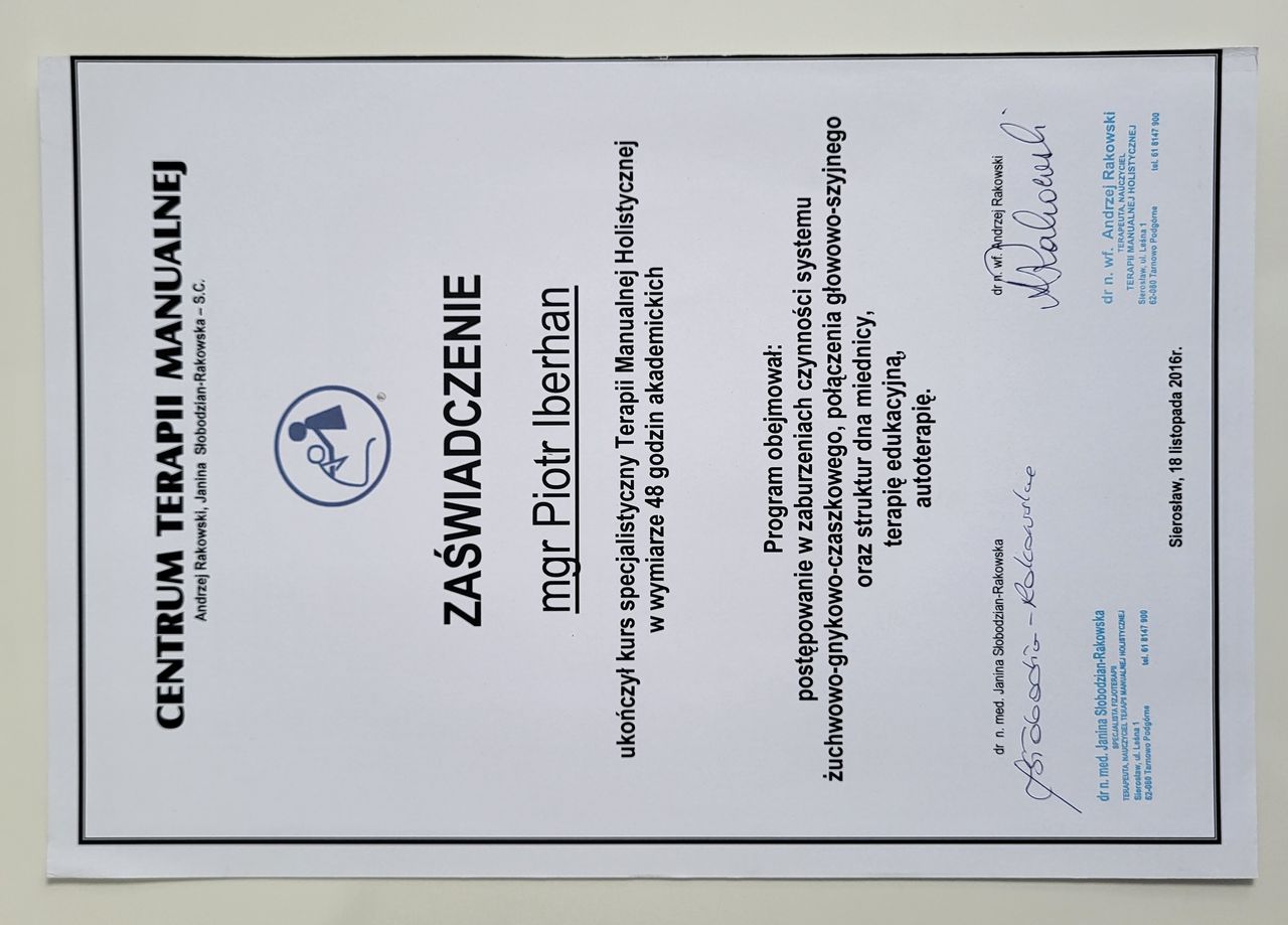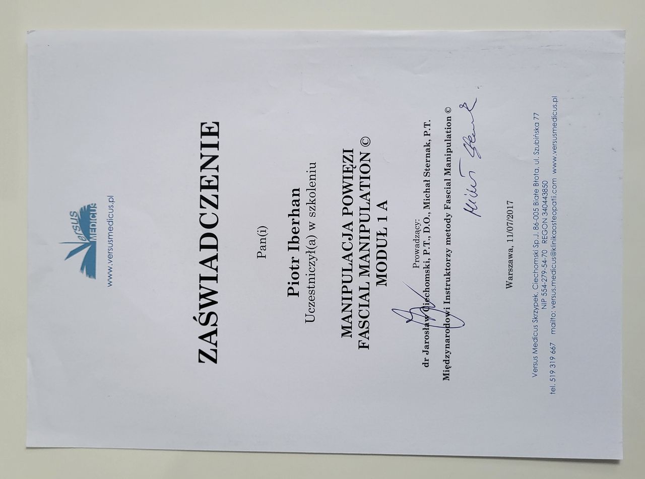 Nazywam się Piotr Iberhan. Jestem mgr fizjoterapii. Szereg ukończonych przeze mnie szkoleń i ciągle rozwijana wiedza umożliwia mi pracę z pacjentem w każdym wieku.