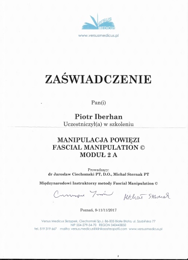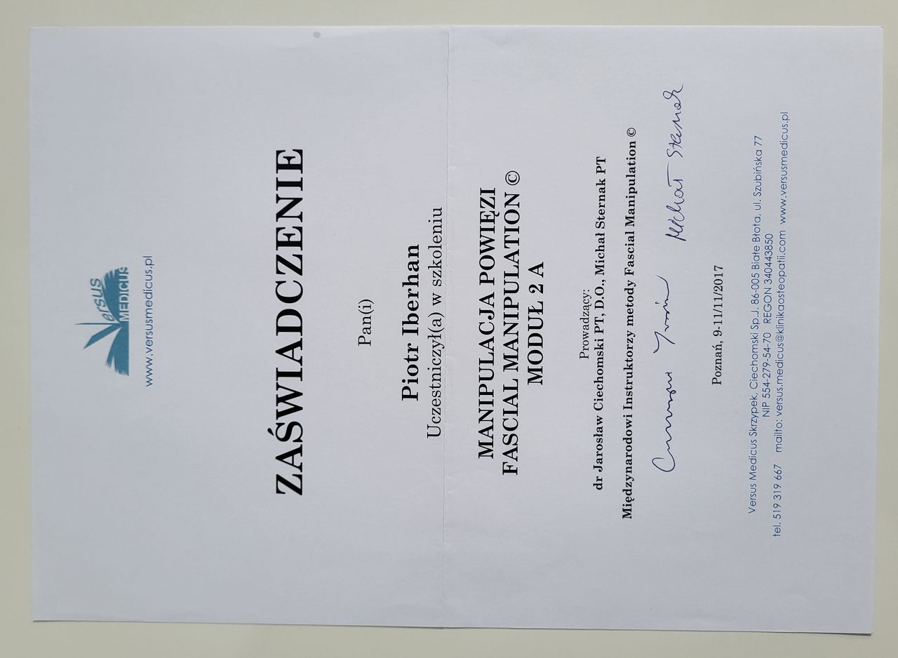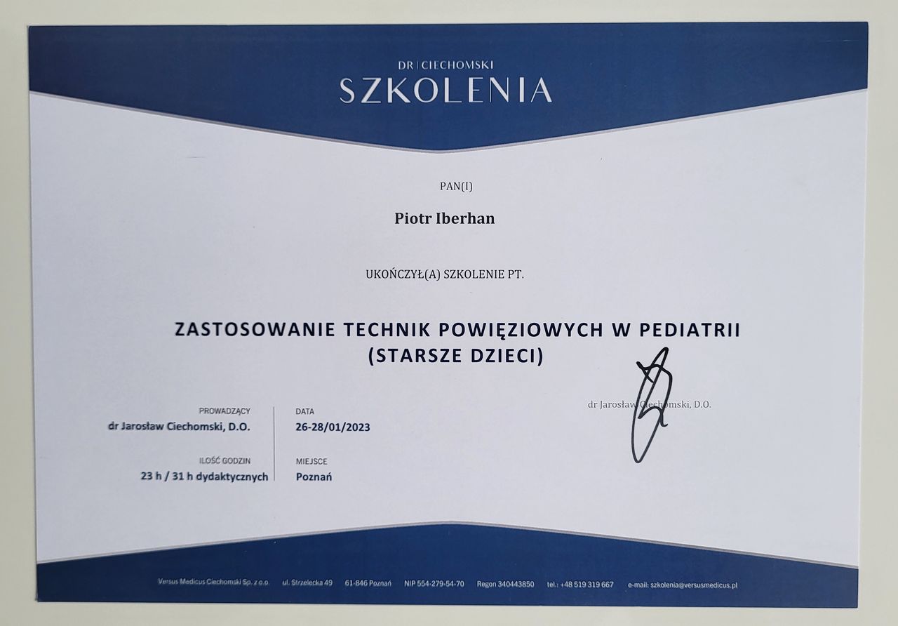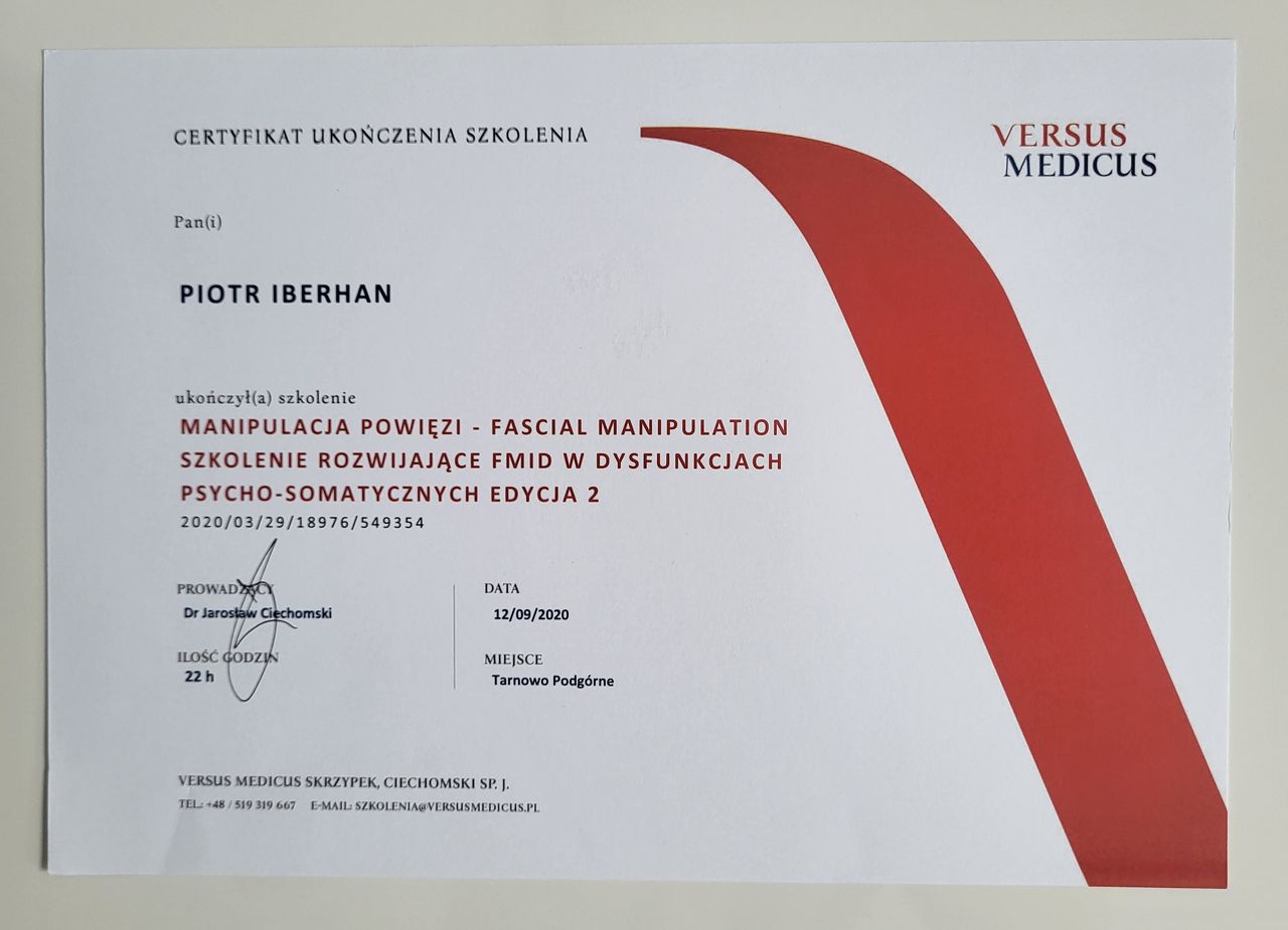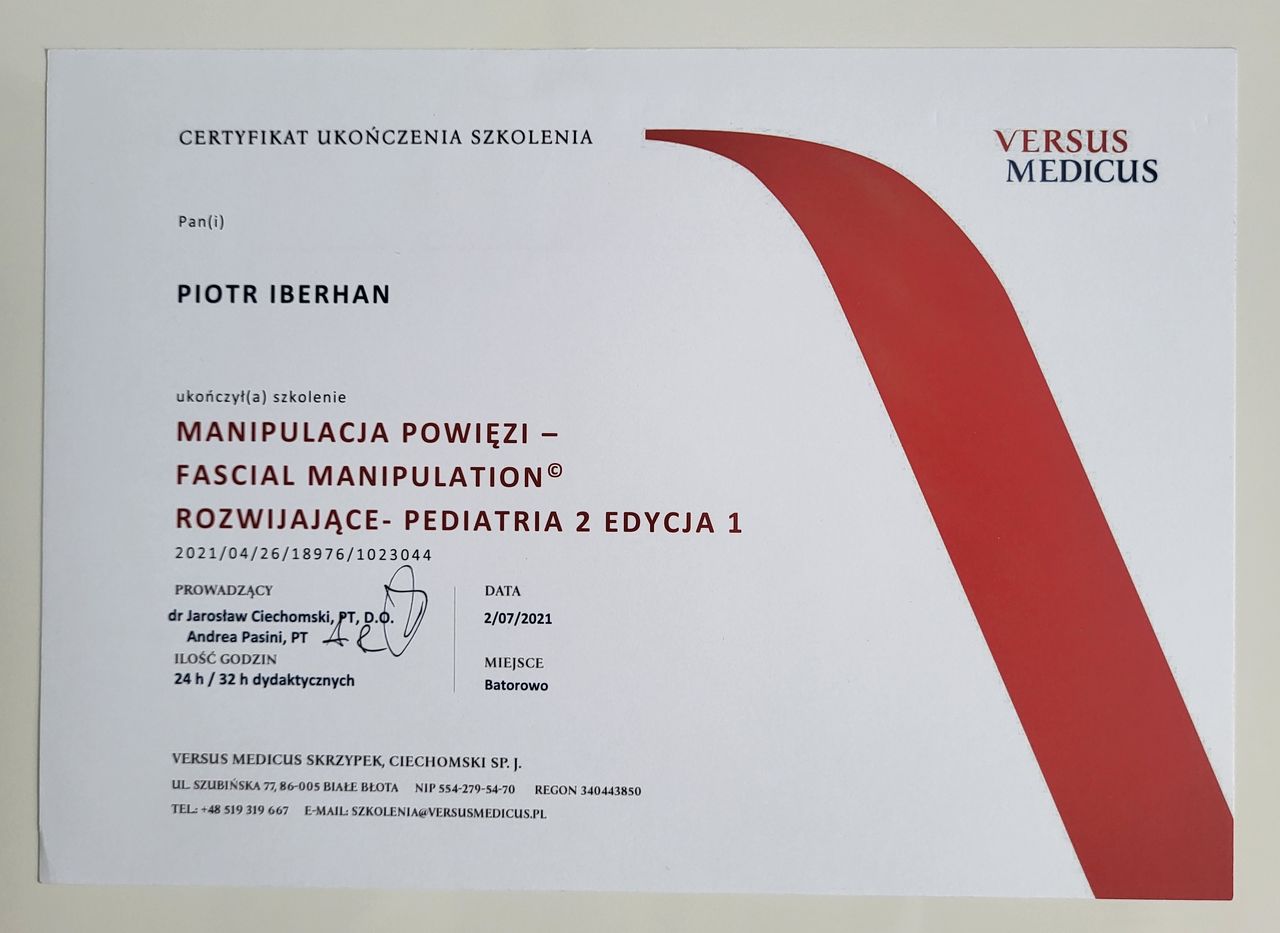 Nazywam się Piotr Iberhan. Jestem mgr fizjoterapii. Szereg ukończonych przeze mnie szkoleń i ciągle rozwijana wiedza umożliwia mi pracę z pacjentem w każdym wieku.