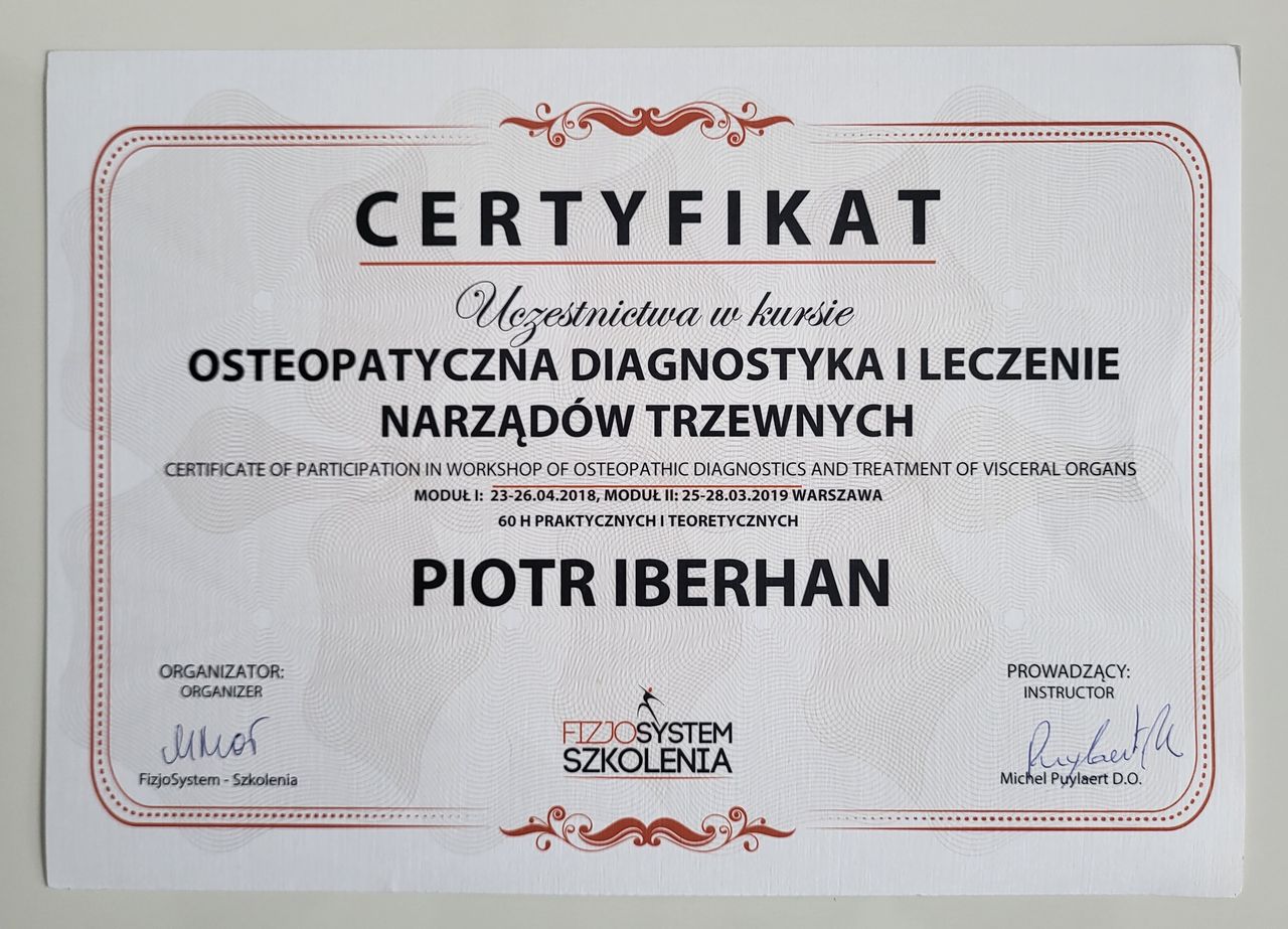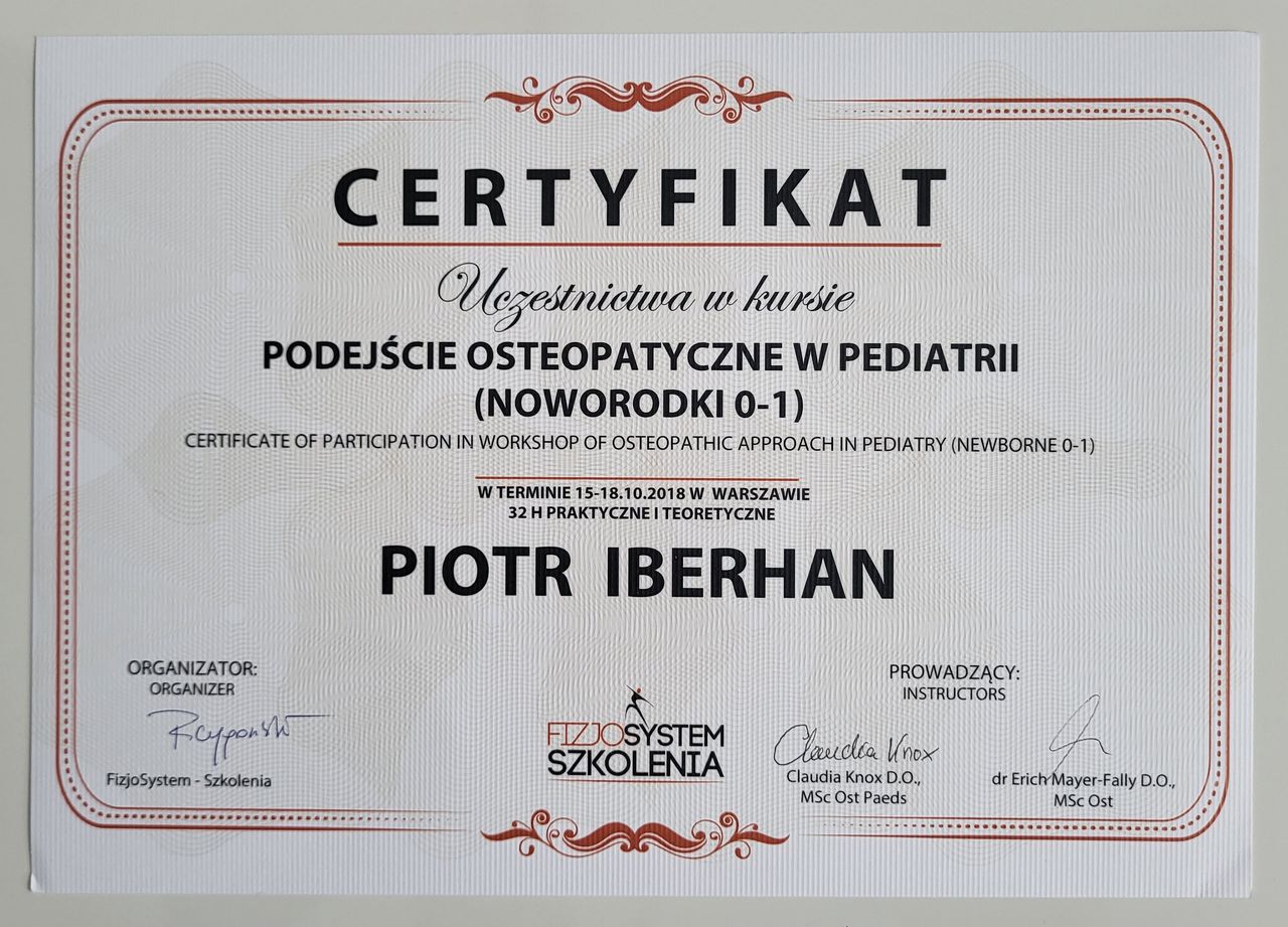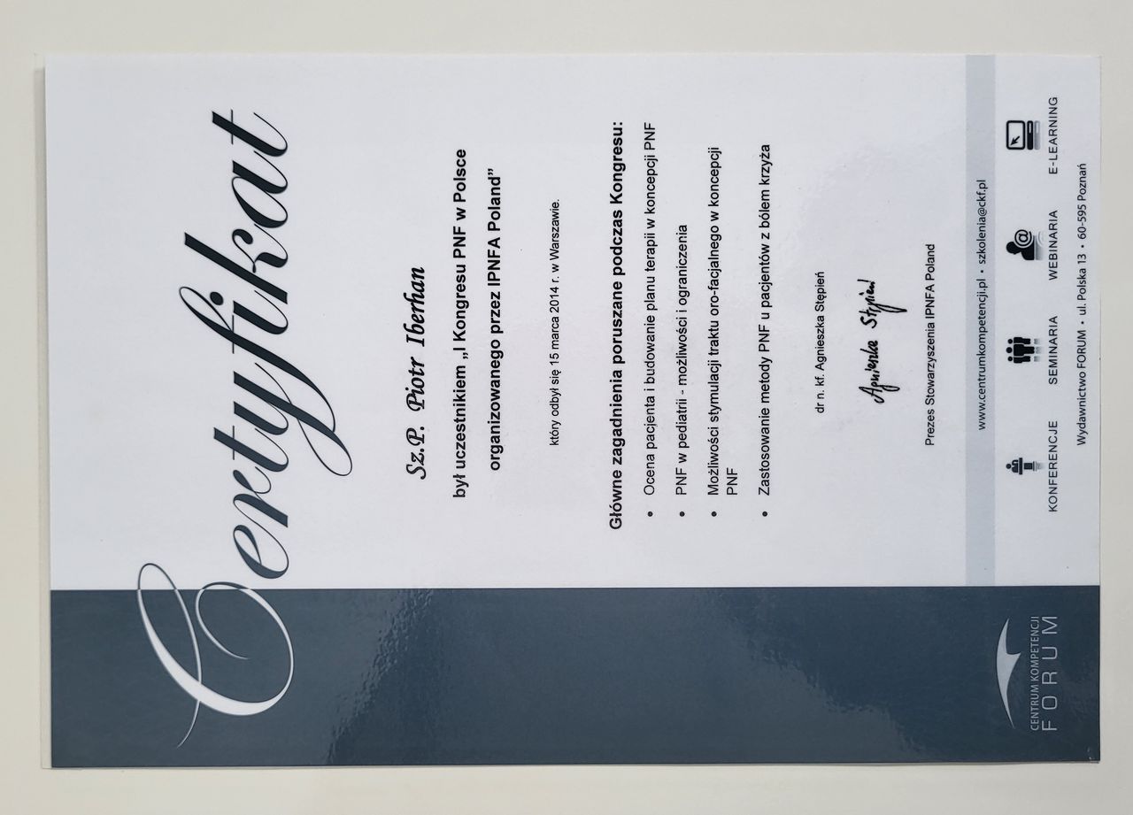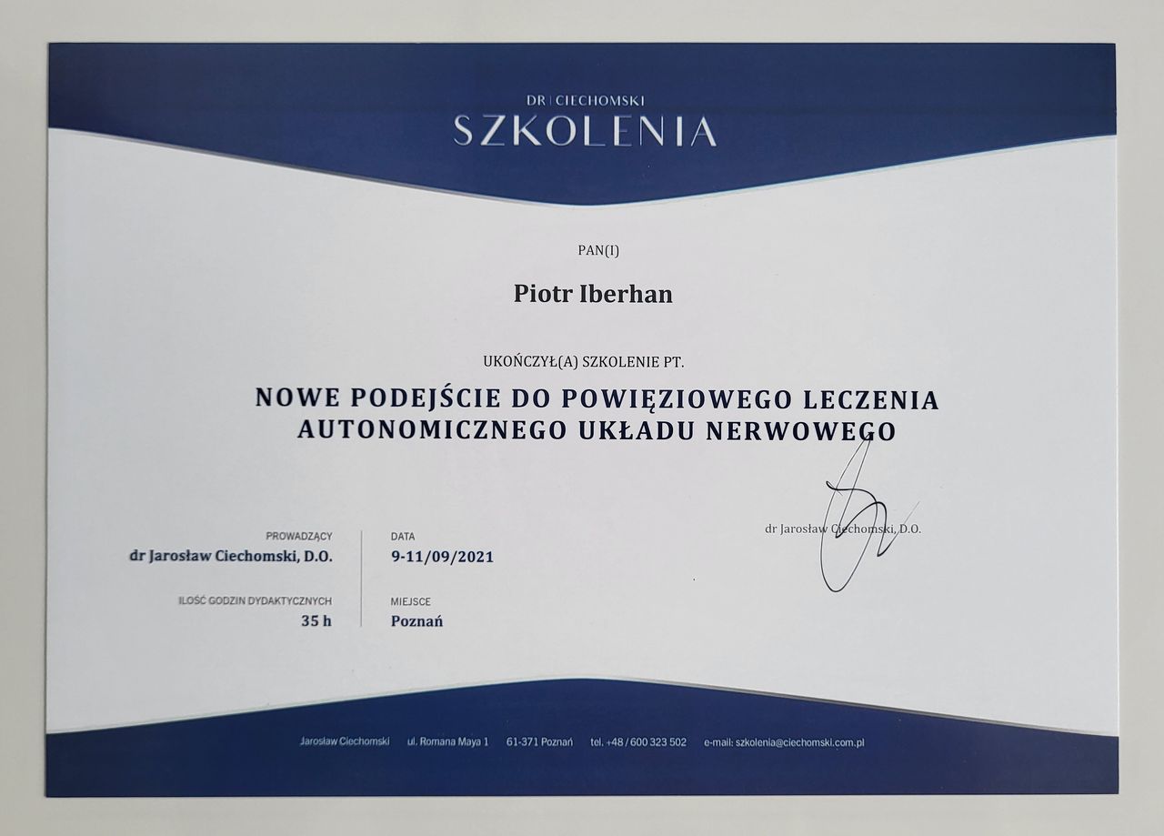 Nazywam się Piotr Iberhan. Jestem mgr fizjoterapii. Szereg ukończonych przeze mnie szkoleń i ciągle rozwijana wiedza umożliwia mi pracę z pacjentem w każdym wieku.