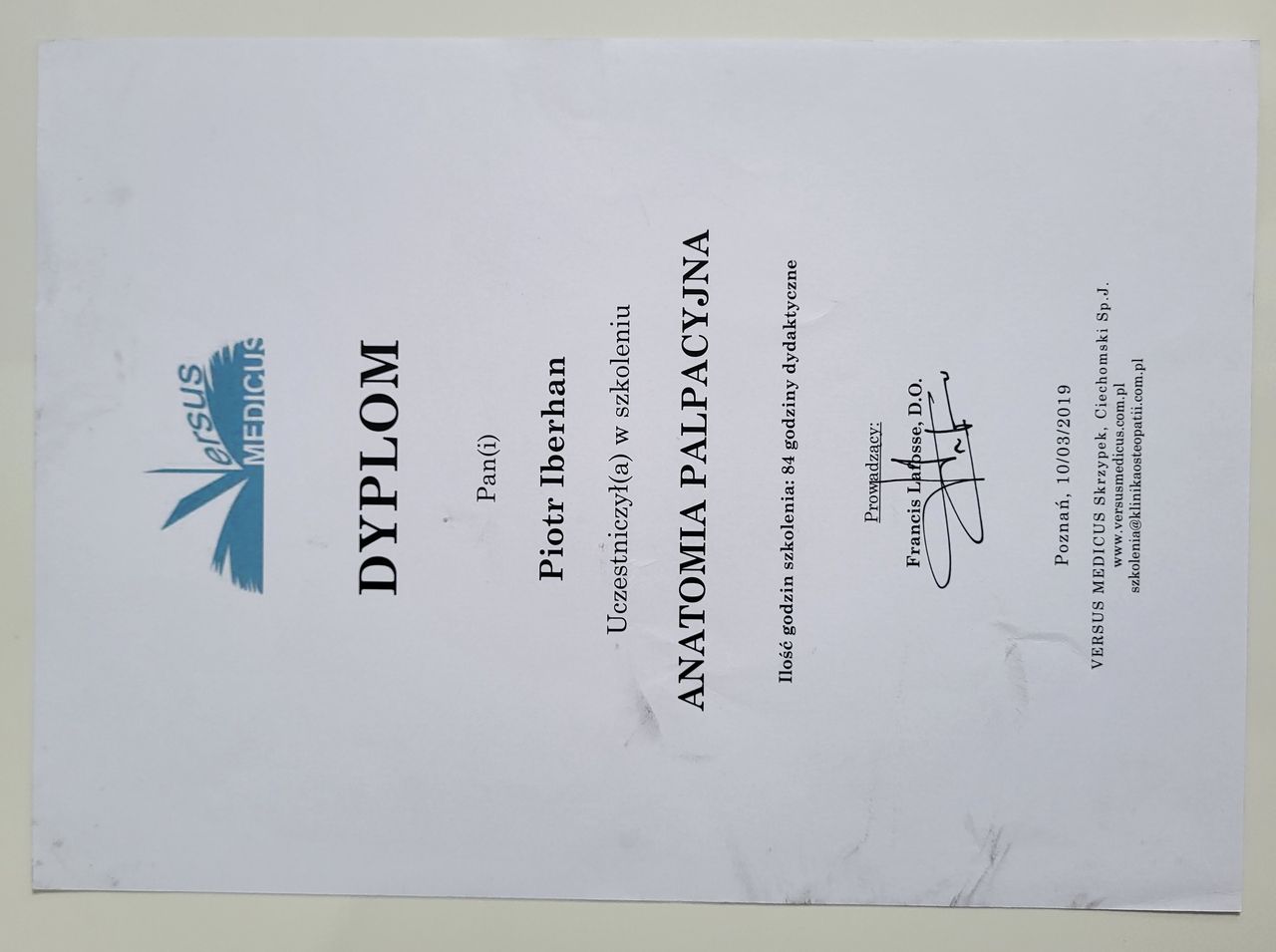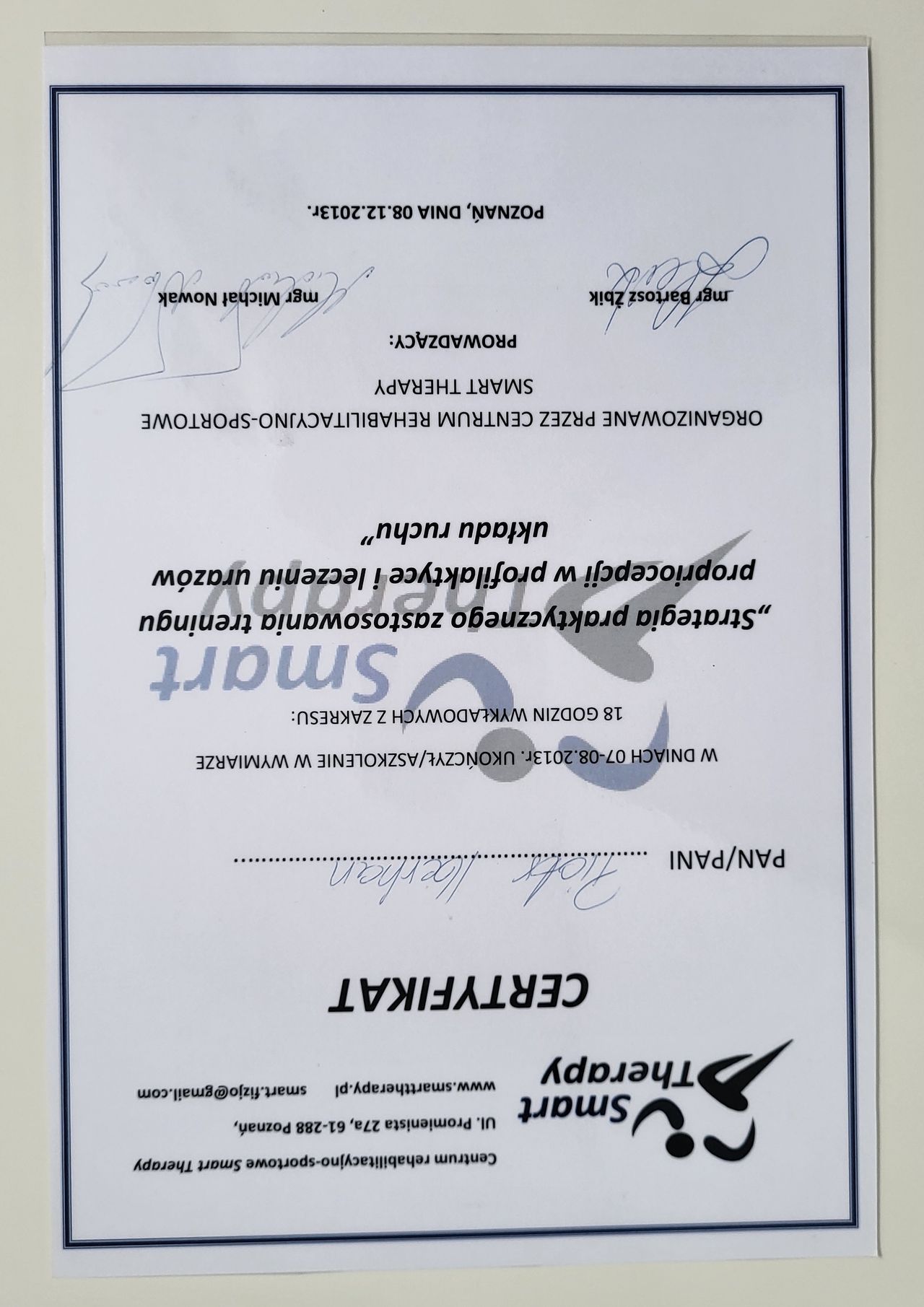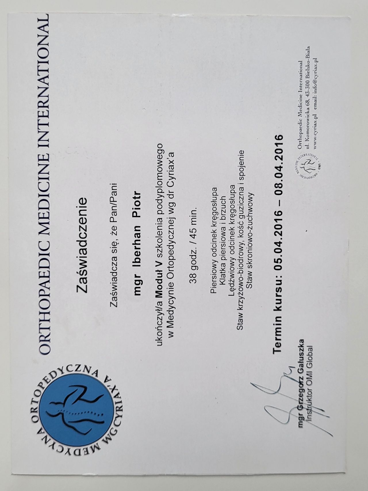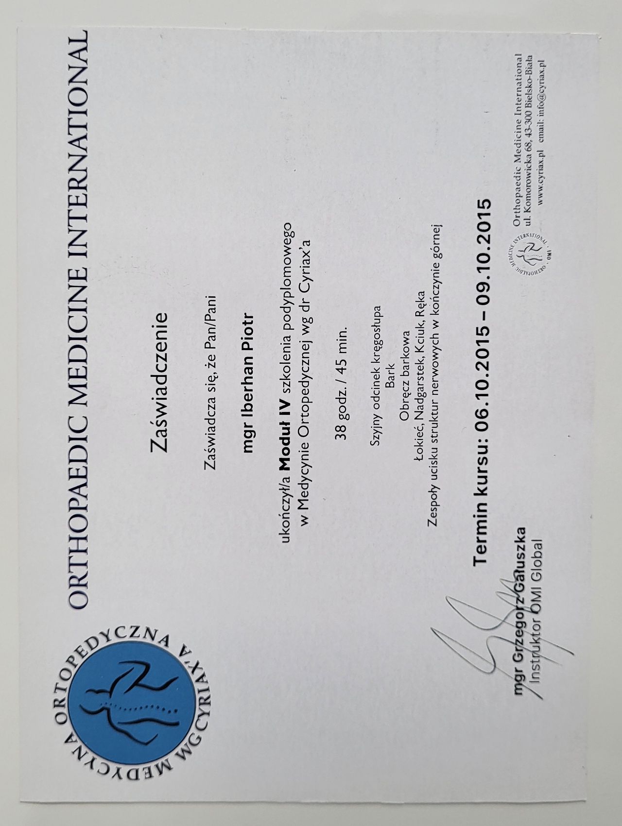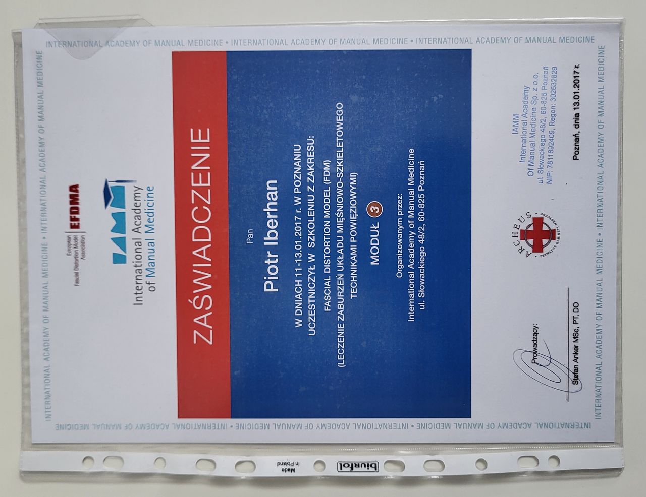 Poza specjalistycznymi szkoleniami w 2025r. zdecydowałem się na kolejny krok w mojej praktyce zawodowej i rozpocząłem studia na Akademii Osteopatii w Poznaniu.