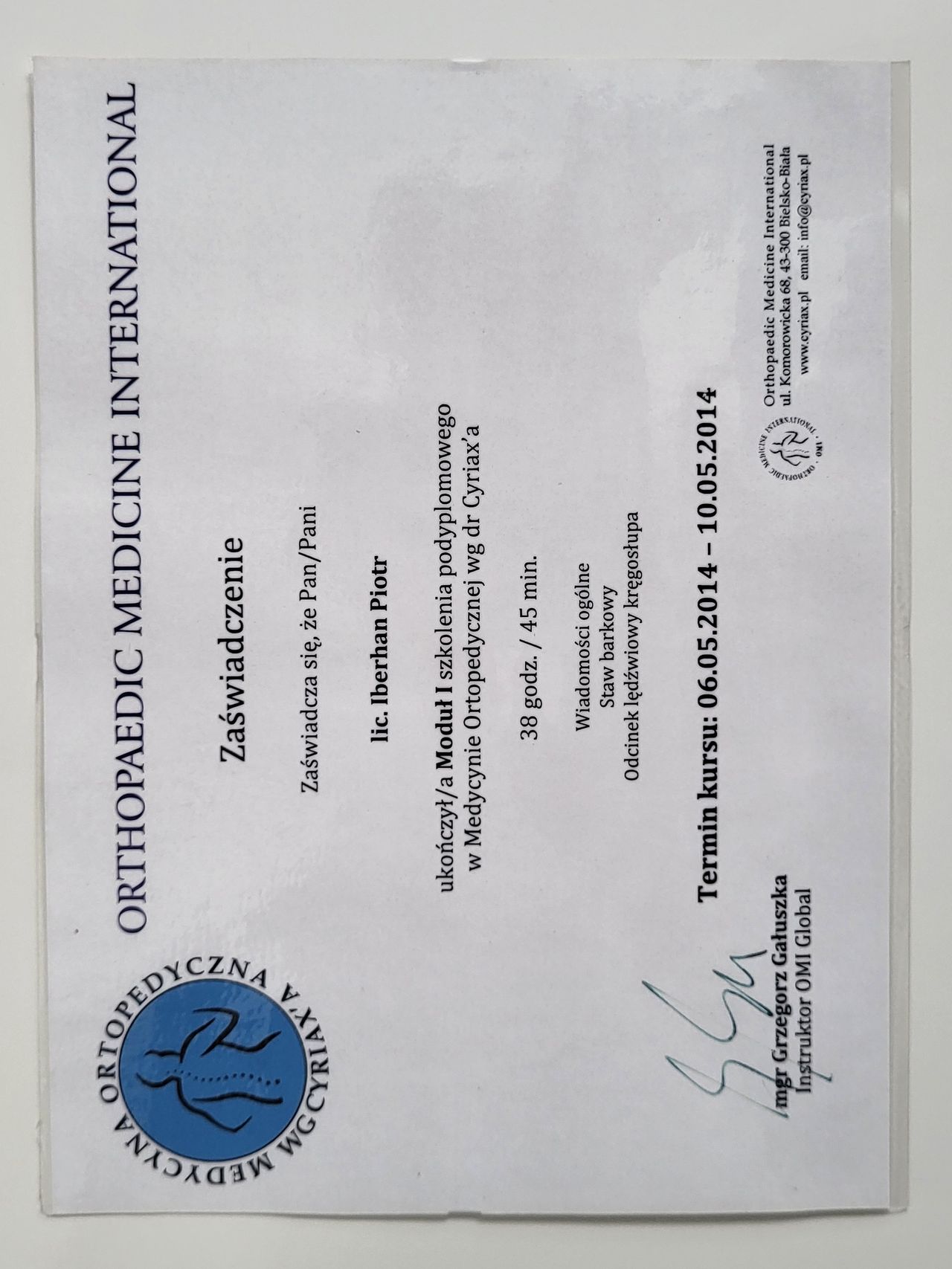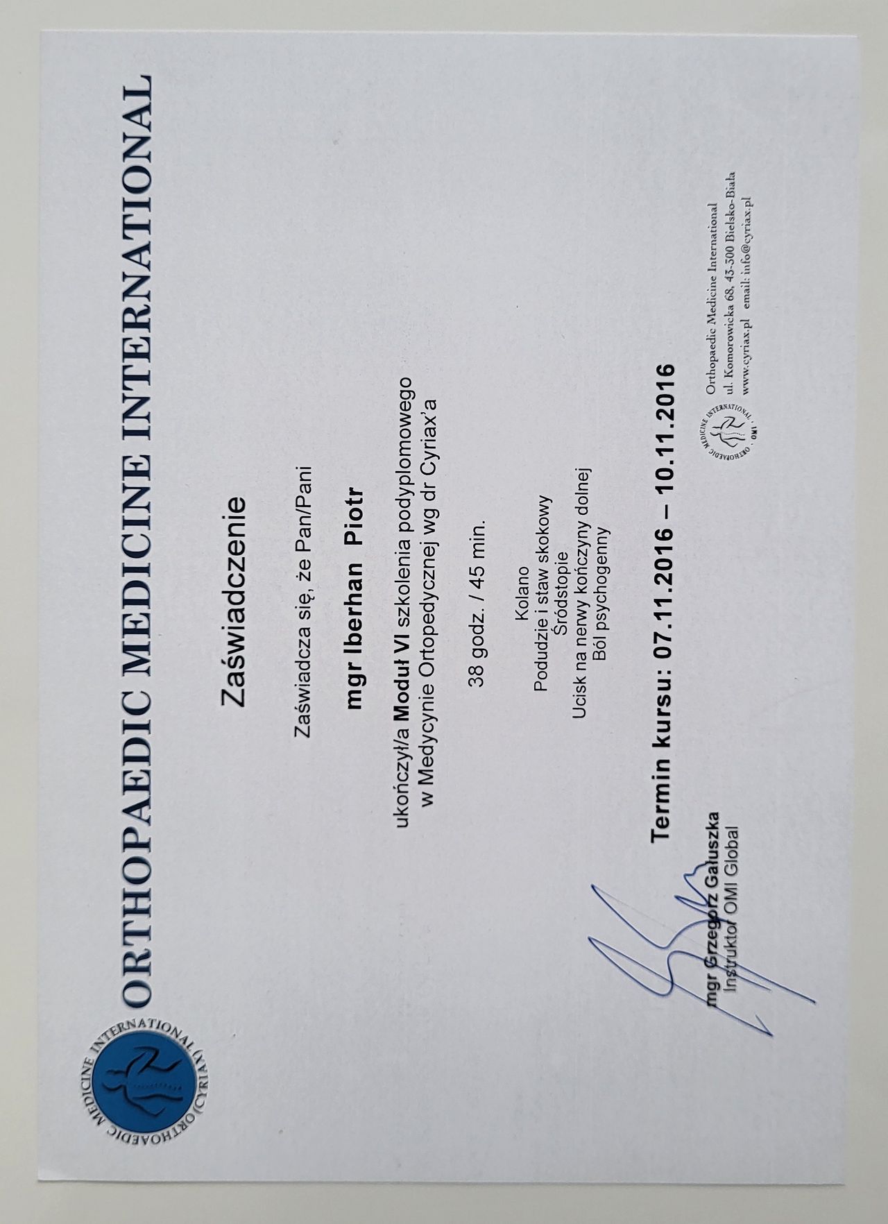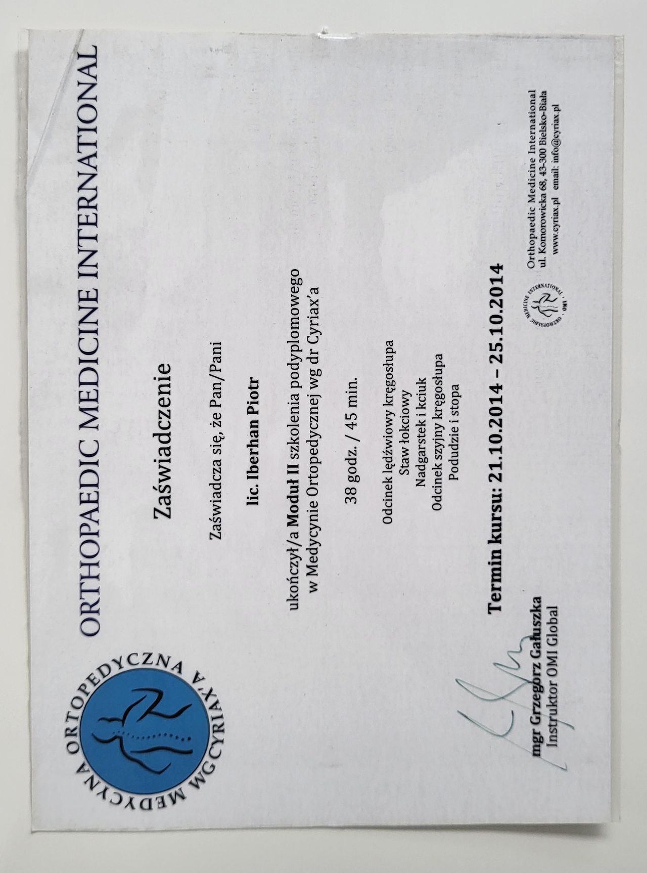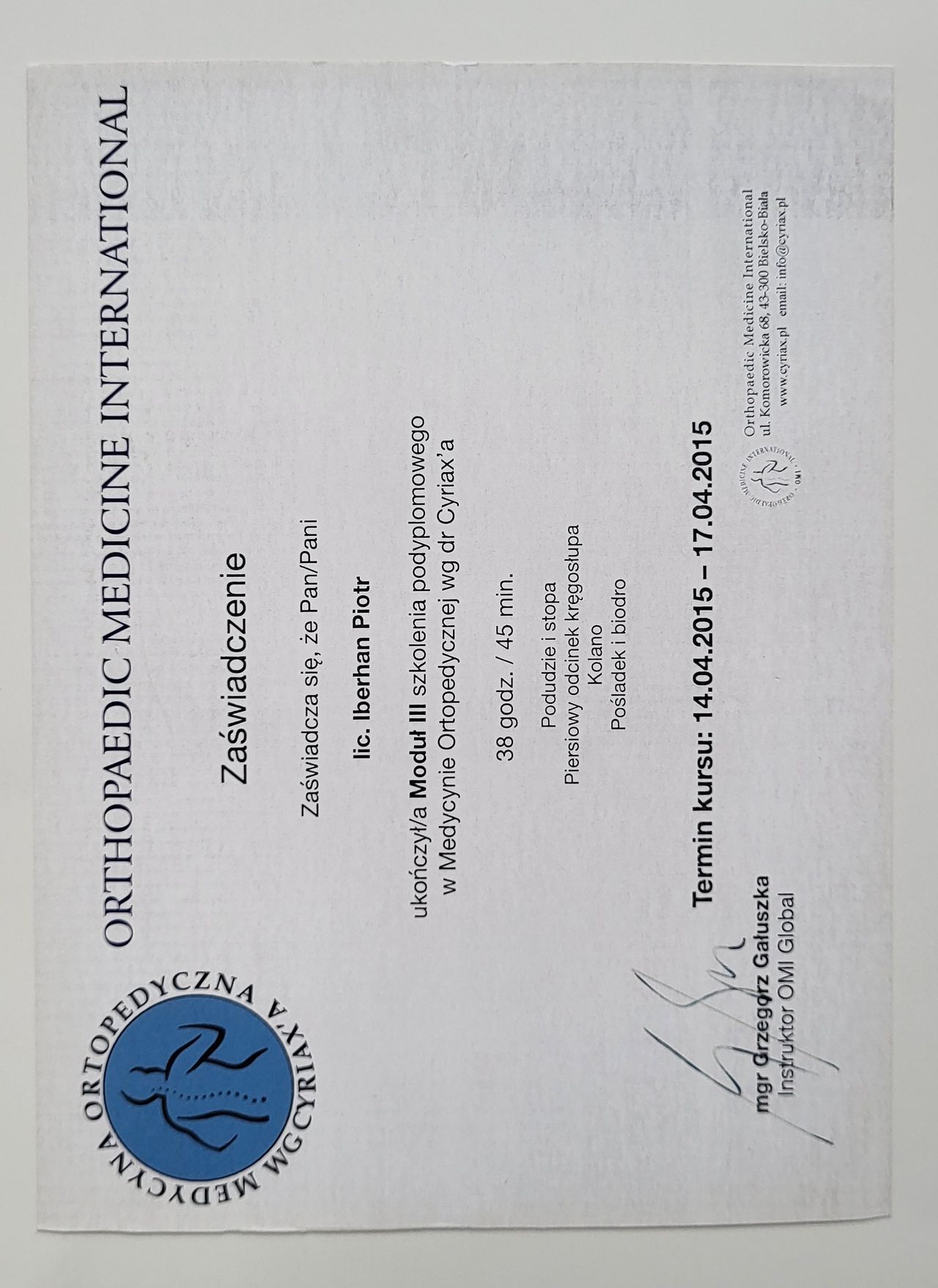 Poza specjalistycznymi szkoleniami w 2025r. zdecydowałem się na kolejny krok w mojej praktyce zawodowej i rozpocząłem studia na Akademii Osteopatii w Poznaniu.
