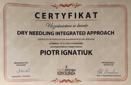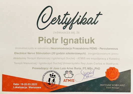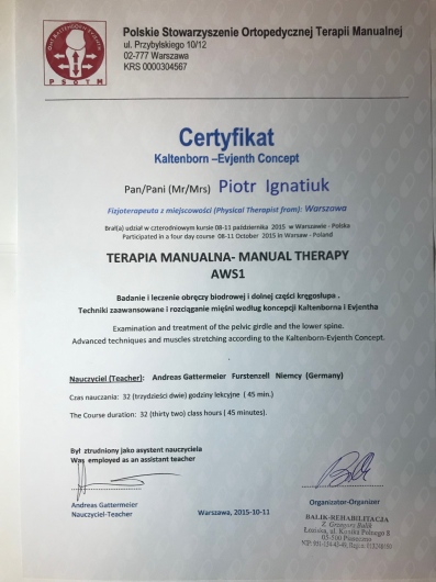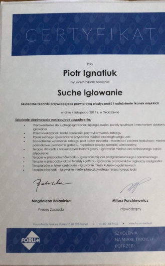 Posiadam piętnastoletnie doświadczenie zawodowe z zakresu terapii manualnej i rehabilitacji ortopedycznej, pourazowej, a także pooperacyjnej poświadczone wieloma certyfikatami z ukończonych kursów. Swoje wieloletnie doświadczanie zdobywałem współpracując z Polskim Komitetem Olimpijskim.
