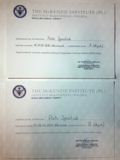 • Diagnozowanie i leczenie zespołów bólowych kręgosłupa i kończyn: Certyfikat Instytutu McKenziego