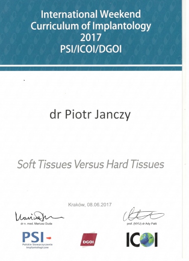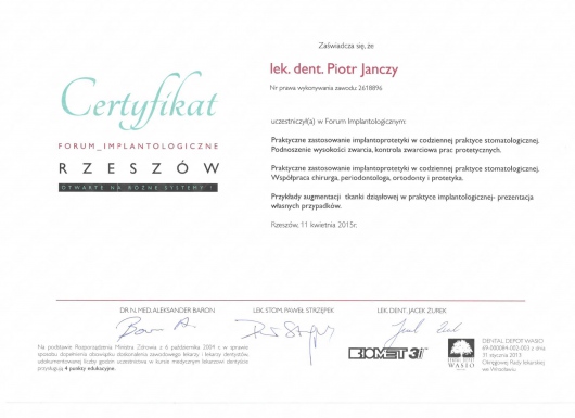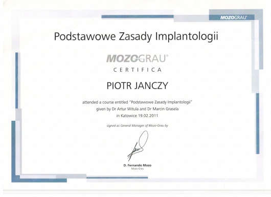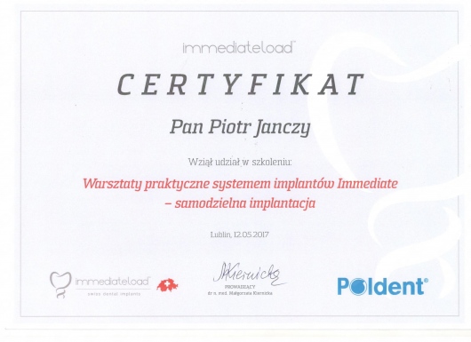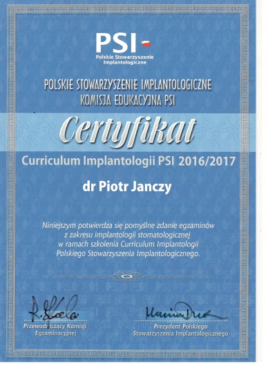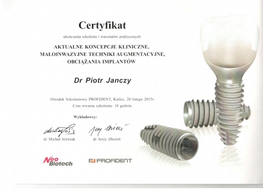 Jaki jest zakres porad oferowanych przez Piotr Janczy?Piotr Janczy to stomatolog. Na podstawie swojego doświadczenia i wykształcenia Piotr Janczy oferuje usługi takie jak: konsultacja implantologiczna, Konsultacja chirurgiczna, All on 4 - odbudowa całego łuku zębowego na 4 implantach.