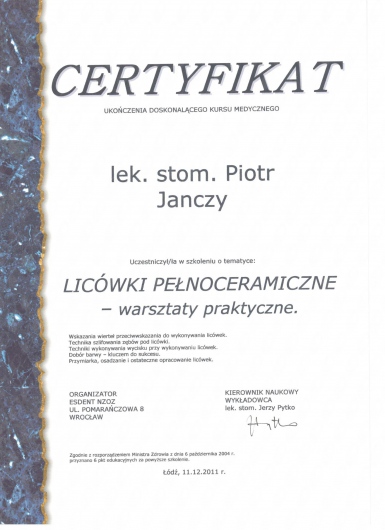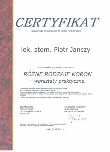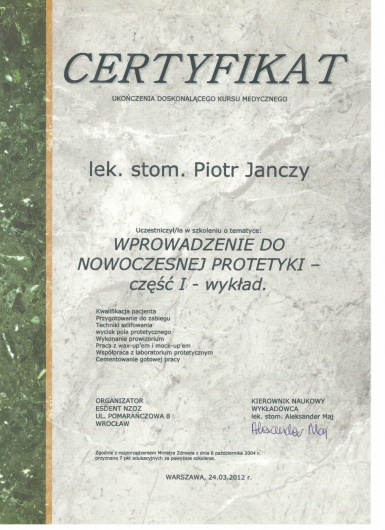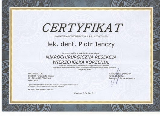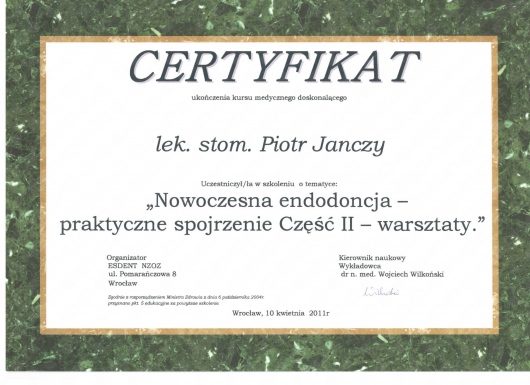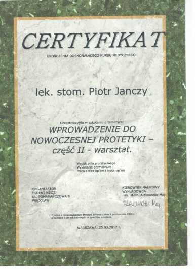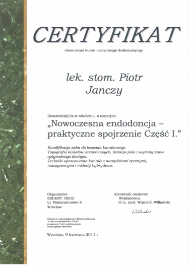 Pod okiem znanych specjalistów odbył podyplomowy staż kliniczny w Uniwersyteckiej Klinice Stomatologicznej w Krakowie.