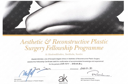 Swoją edukację w zakresie chirurgii plastycznej rozpoczął od stażu podstawowego w Klinice Chirurgii Plastycznej CMKP w Warszawie. Następnie odbył staż z zakresu chirurgii estetycznej w ramach Fellowshipu w Akademikliniken w Sztokholmie, jednej z najbardziej renomowanych klinik chirurgii plastycznej na świecie, pod kierunkiem doc. Per Hedéna.