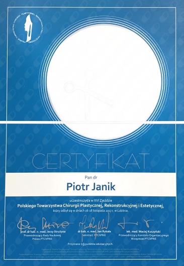 Dr Piotr Janik zdobywał również doświadczenie zawodowe w Klinice Chirurgii Ogólnej, Onkologicznej, Metabolicznej i Torakochirurgii Wojskowego Instytutu Medycznego w Warszawie. W latach 2017-2019 współpracował z Kliniką dr Szczyt, a w latach 2019 - 2024 również z Kliniką Ambroziak.